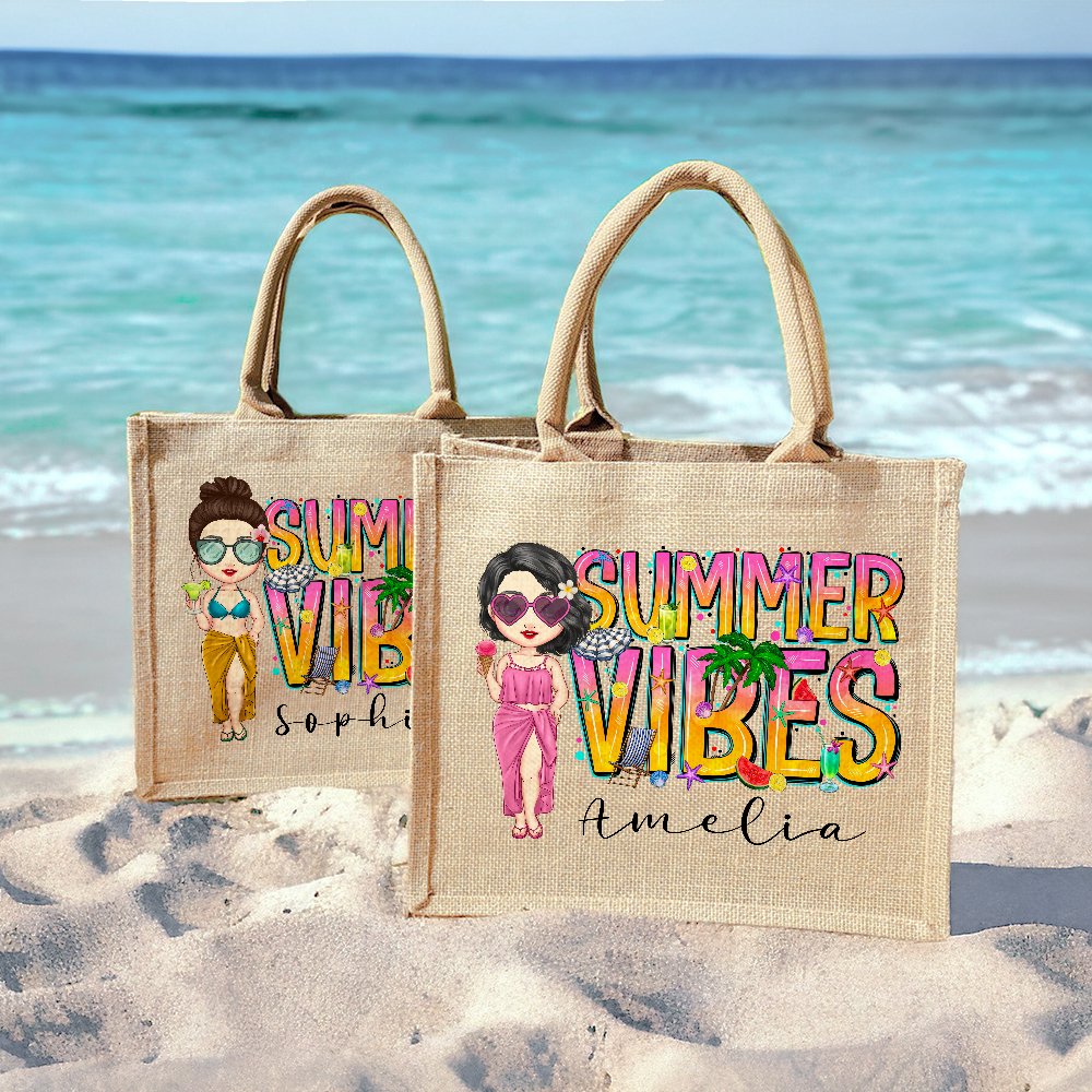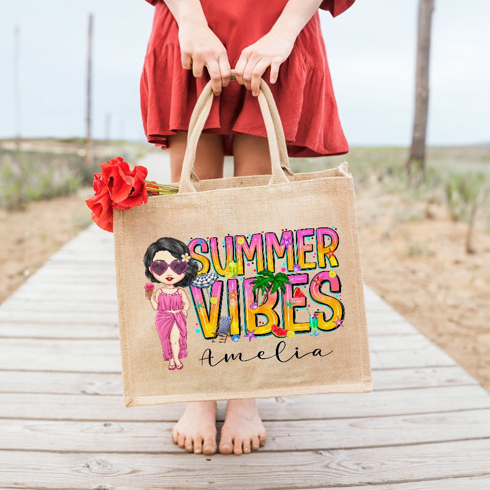 Personalized Cute Cartoon Girl Summer Vibes Jute Tote Bag with Name Holiday Beach Party Birthday Gift for Women