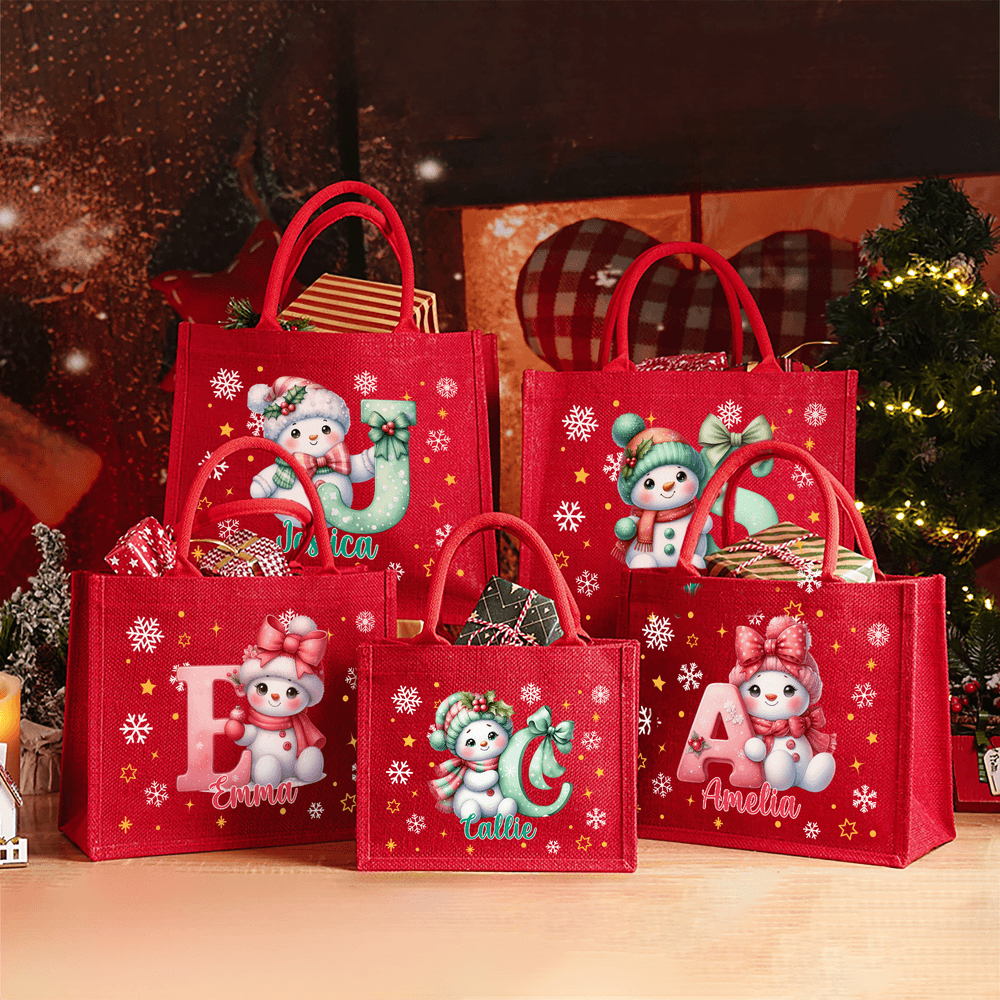 Personalized Cute Cartoon Snowman Large Jute Tote Bag with Name and Initial Party Favors Christmas Gift for Kids Family Friends