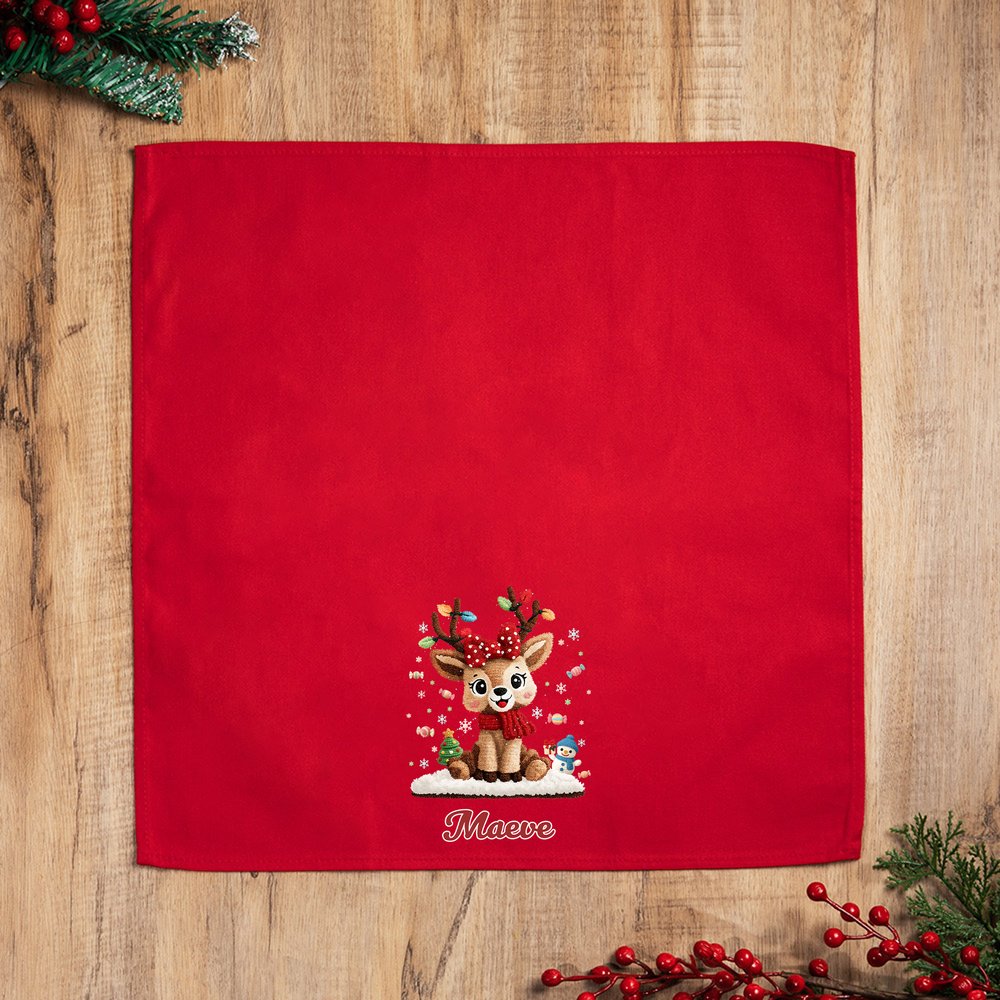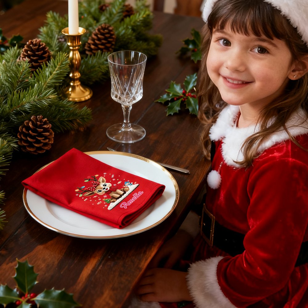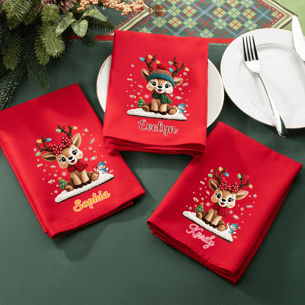 These napkins feature a classic red base with an adorable Christmas reindeer cartoon pattern, instantly brightening the festive atmosphere of the dining table. The name of a family member, child, or friend can be printed on the napkin, making each one a unique keepsake. This unique design perfectly blends Christmas elements with personalization, breaking away from the monotony of ordinary napkins.