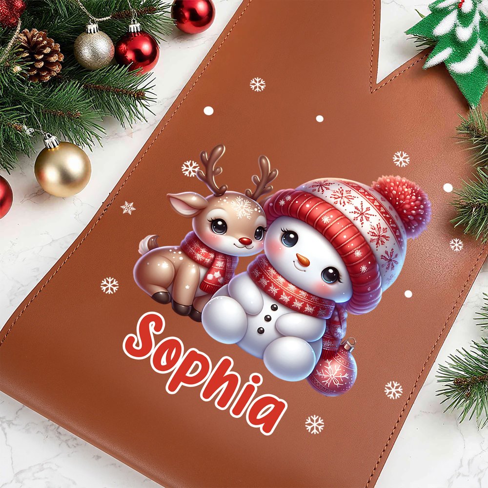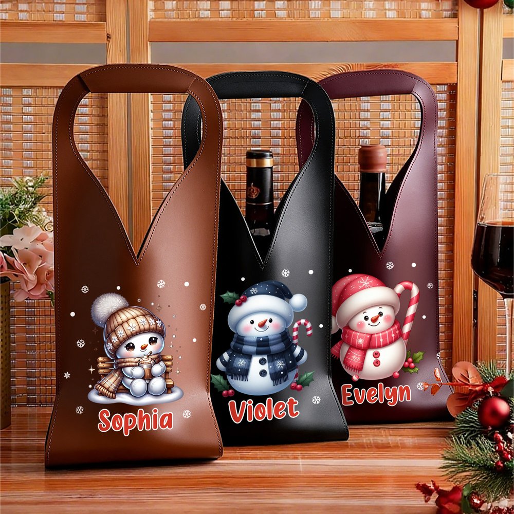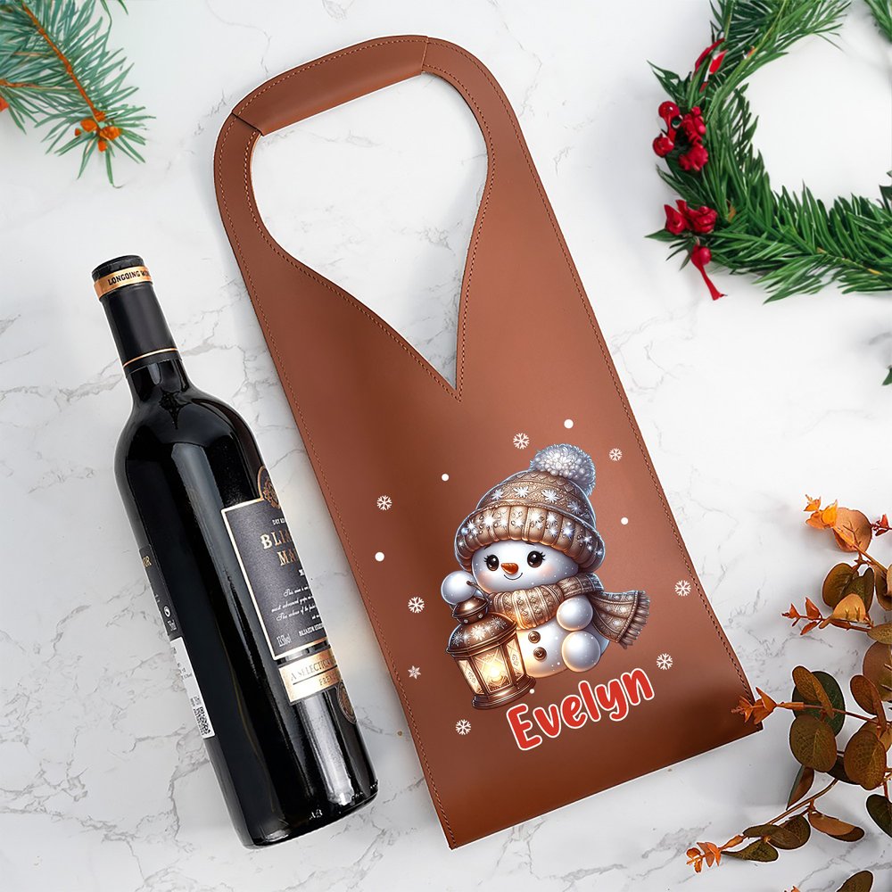 This wine bag merges festive snowman imagery with personalized leather luxury. The customizable colors, snowman patterns, and names create a style that’s both a practical wine carrier and a festive fashion statement—perfect for those who want to celebrate the holidays with a unique, personalized touch while ensuring their wine is transported in style.