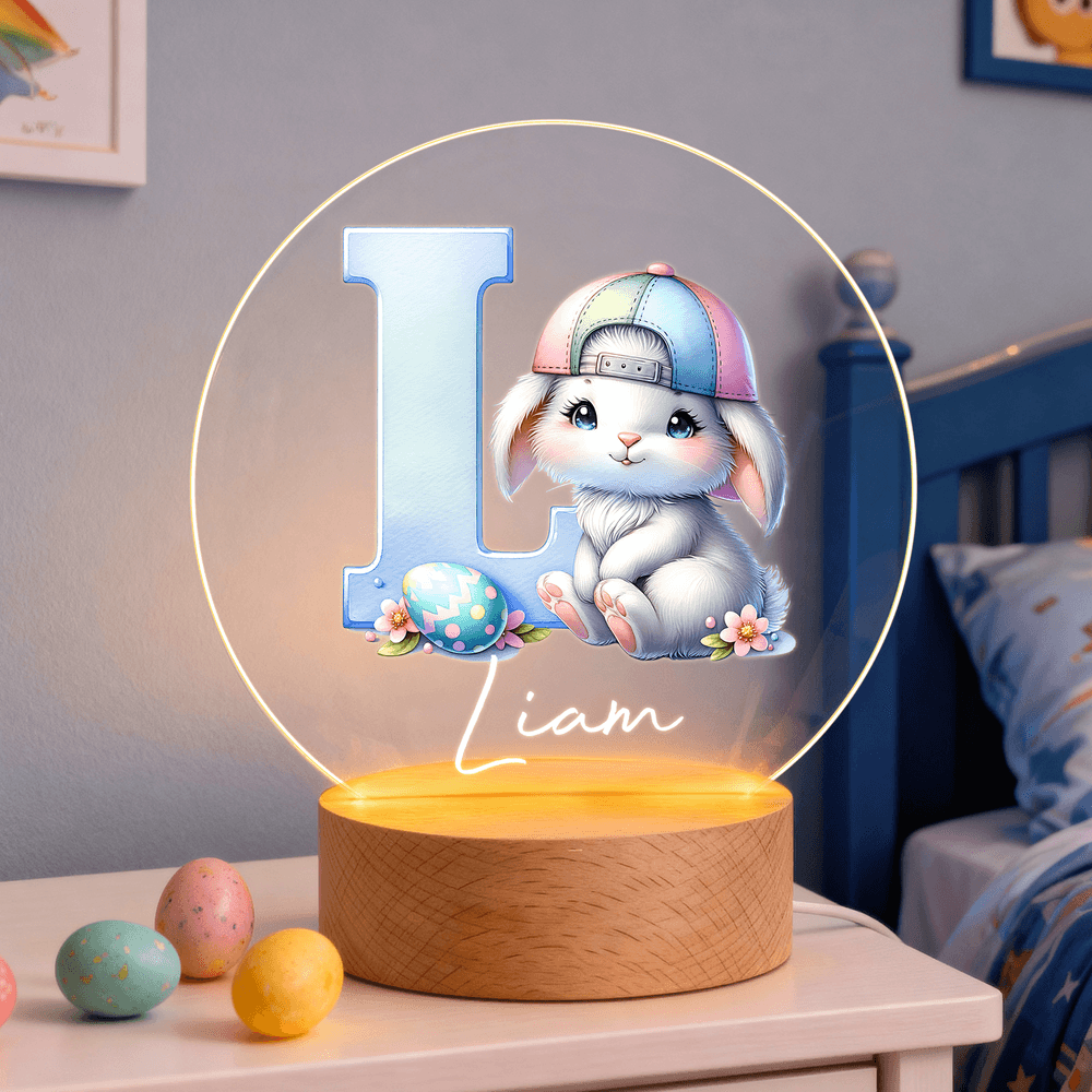 This enchanting night light features a circular shape with a 3D letter at its center, complemented by a cute cartoon bunny. Options include a pink bow or a blue hat, giving it a charming personality. Surrounding elements like Easter eggs, spring flowers, and fresh leaves create a whimsical atmosphere, and you can also customize it with a name, making it truly one-of-a-kind.
