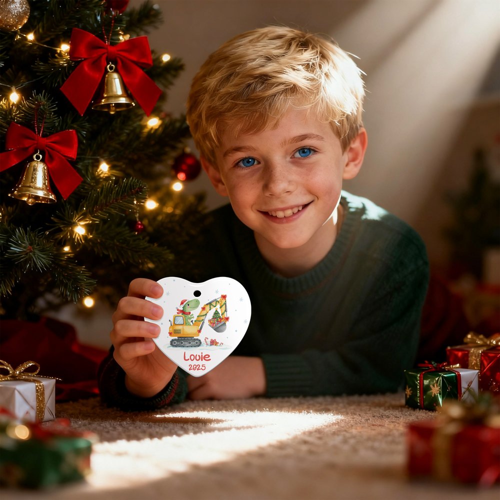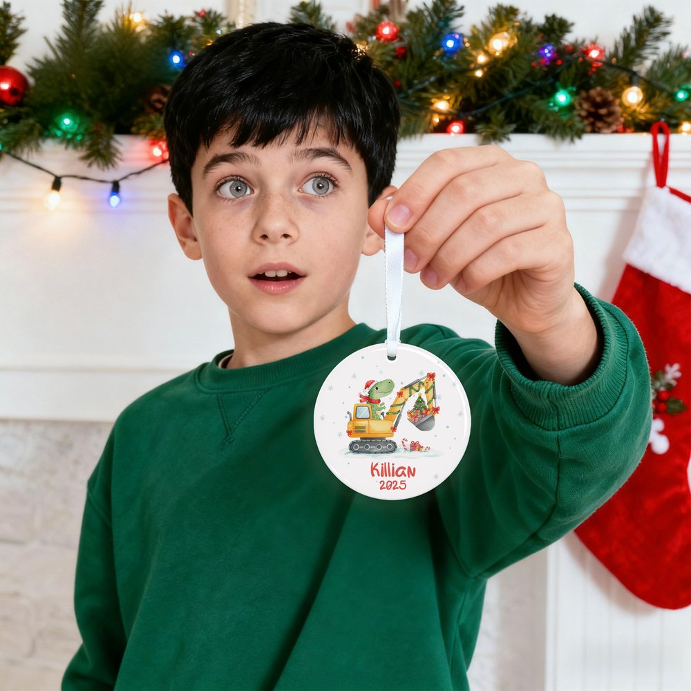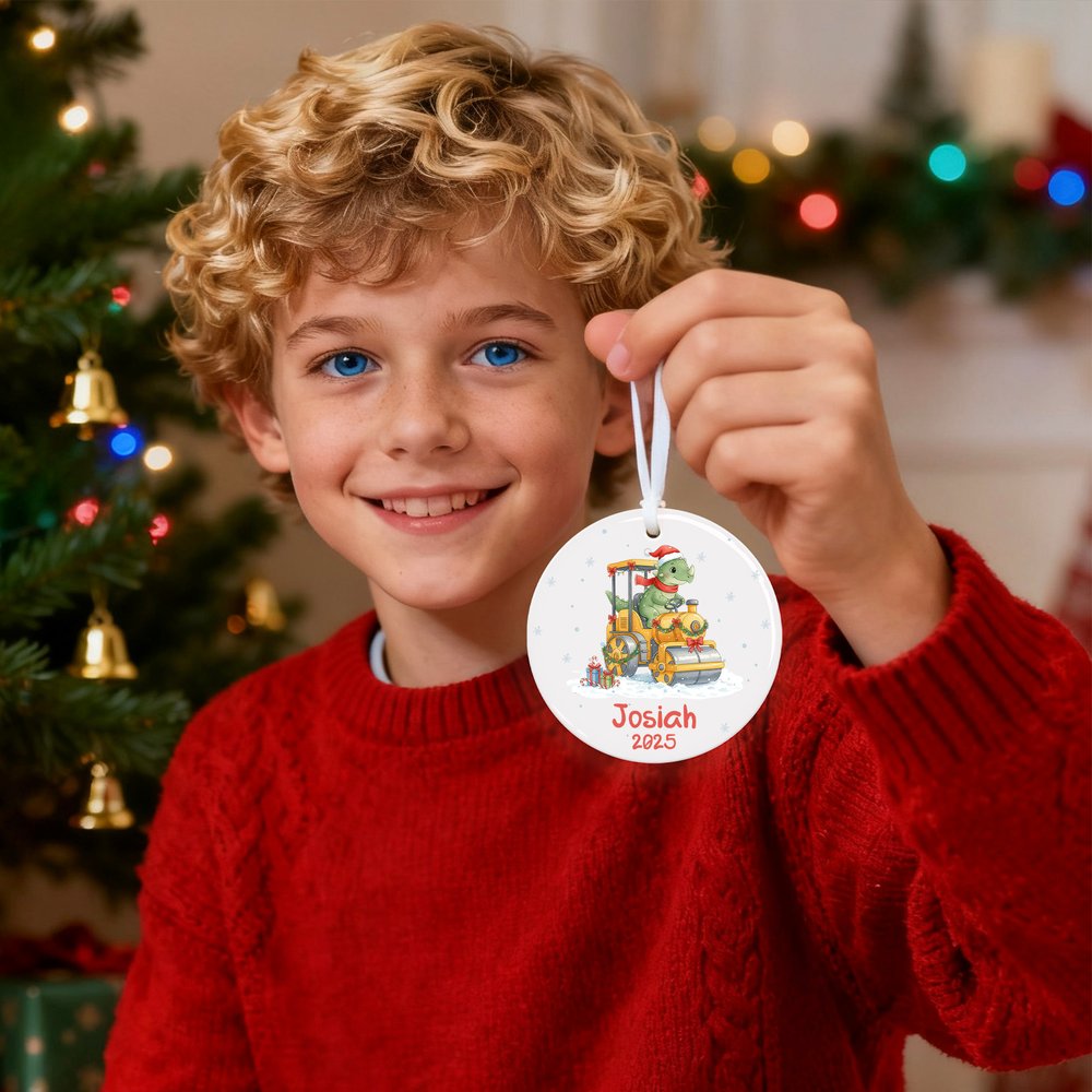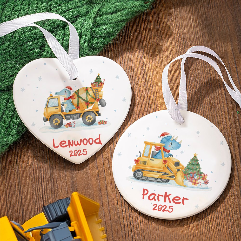 We offer two delightful shapes—a classic circle and a heartwarming heart—featuring an adorable dinosaur in a Santa hat driving a festive construction truck loaded with lights and gifts. With playful details like snowflakes and candy canes, each piece can be personalized with a name and year, making it a one-of-a-kind keepsake full of charm.