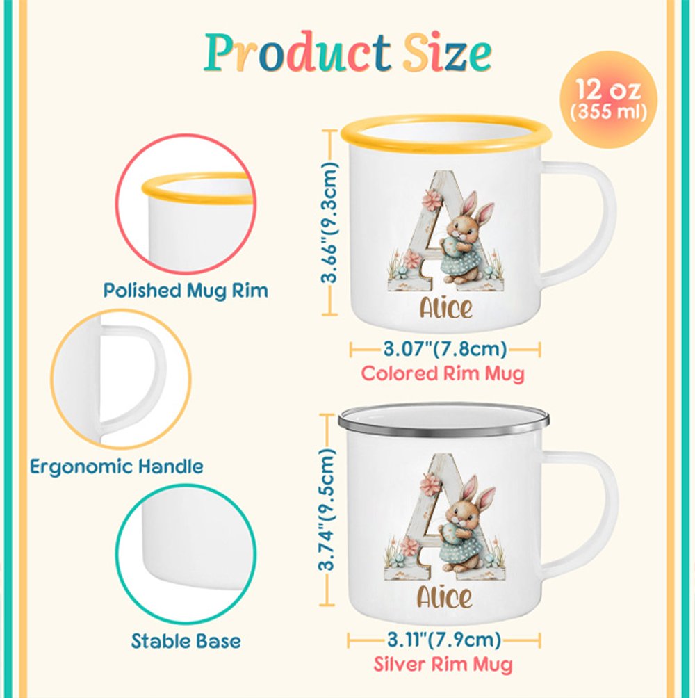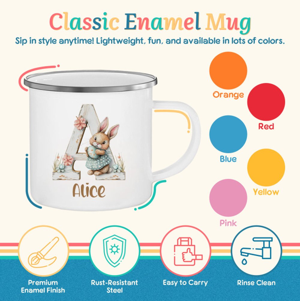 An excellent gift for children, grandchildren, girls/boys, perfect for Easter, birthdays, or holiday gatherings. The personalized name and adorable bunny designs make it a heartfelt, age-appropriate present—kids will love the custom touch, while the durable enamel build ensures it’s both fun and functional for daily use.