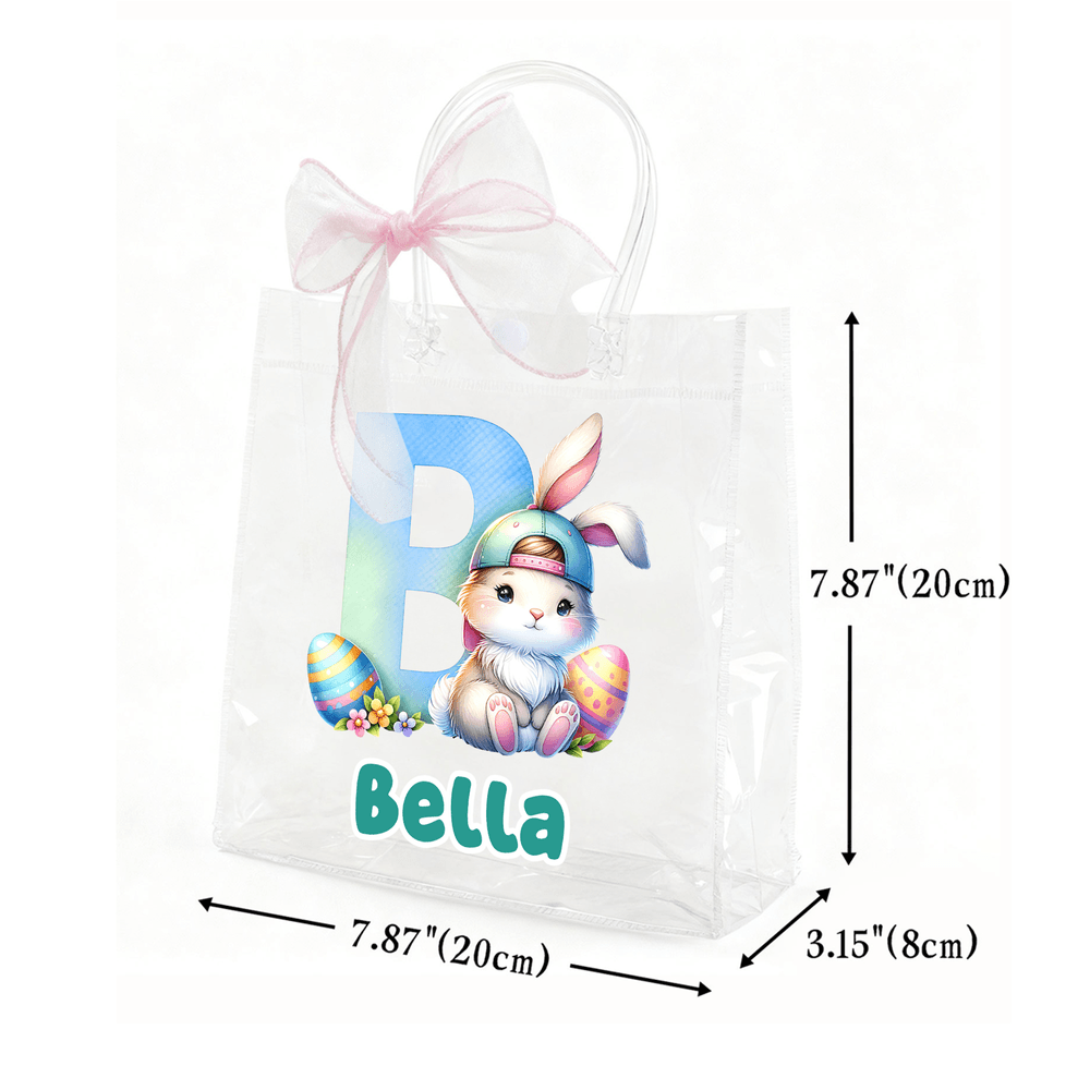 This transparent gift tote bag features a charming pink ribbon bow and playful Easter motifs, including adorable bunnies and colorful scattered eggs. You can personalize it with a custom name and initials, creating a special and festive bag tailored just for your little one.