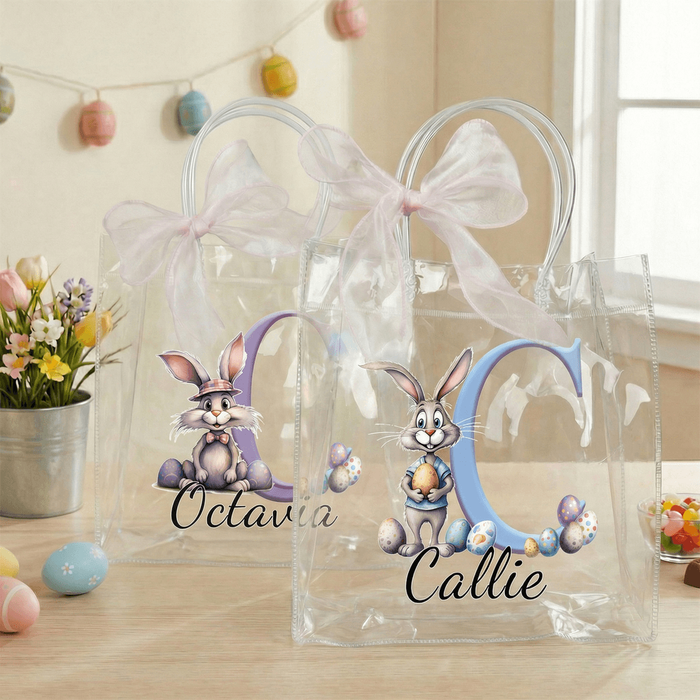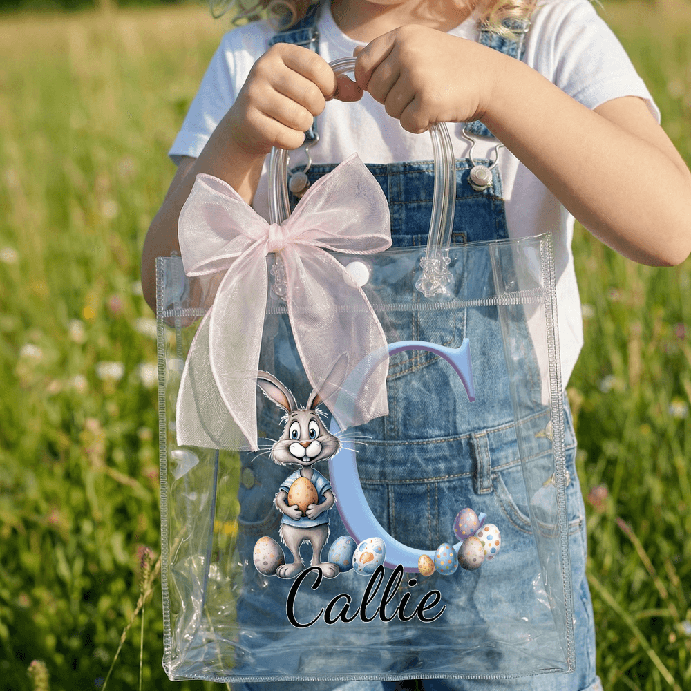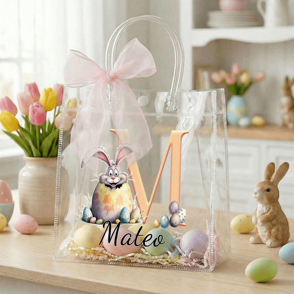 This transparent gift tote bag features a charming pink ribbon bow and playful Easter motifs, including adorable bunnies and colorful scattered eggs. You can personalize it with a custom name and initials, creating a special and festive bag tailored just for your little one.