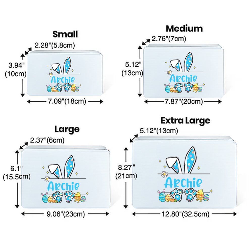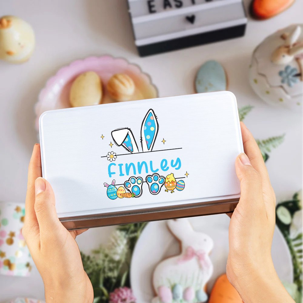 This tin box, available in pink and blue Easter bunnies. The vivid image instantly attracts children's attention. The box can be customized with the child's name, adding a personalized element to make them feel special care and attention.