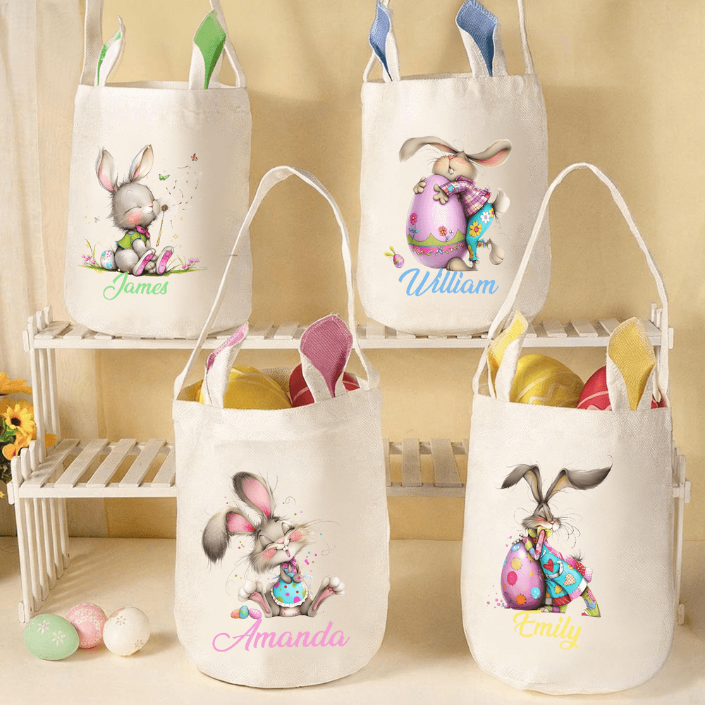 Featuring adorable cartoon bunnies and Easter eggs in its design, this basket also supports personalized name customization. The overall style is playful and festive.