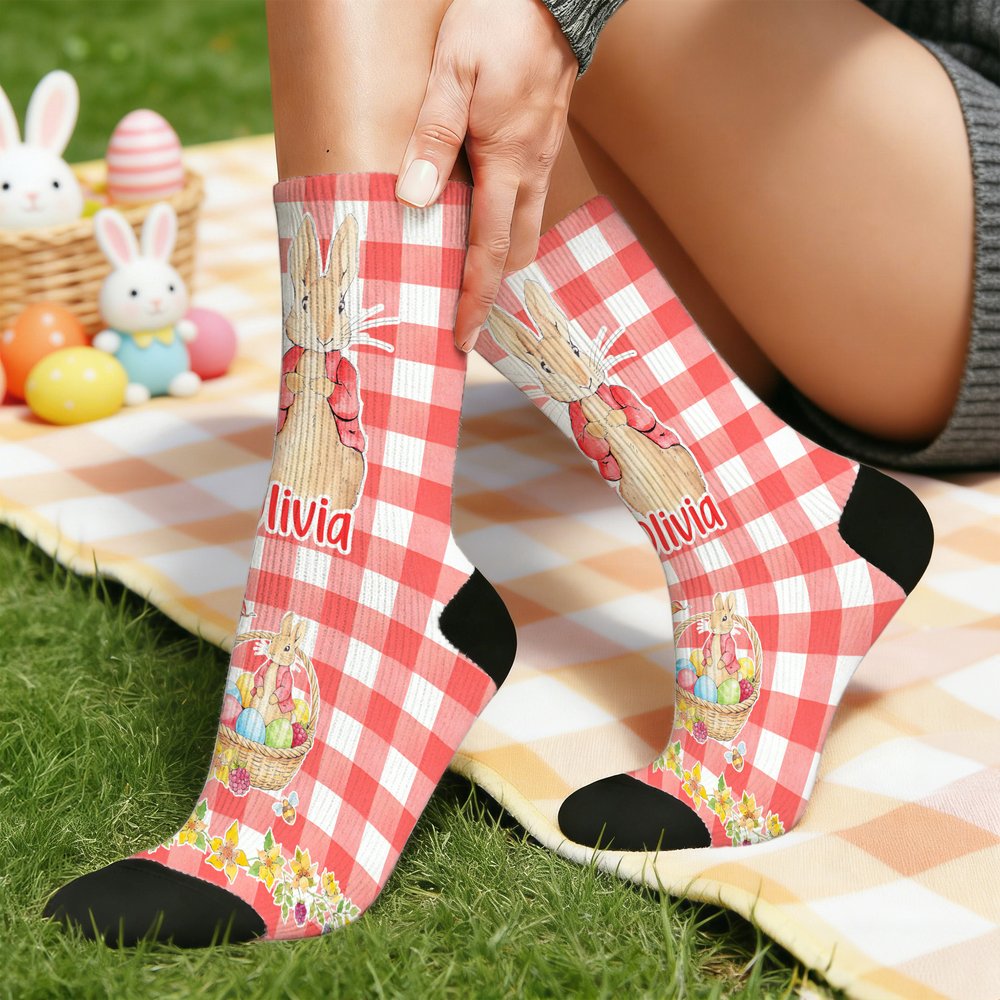 Personalized Cute Easter Bunny Eggs Flower Plaid Design Soft Kid Adult Mid-Calf Socks Daily Wear Easter Gift for Kids Family