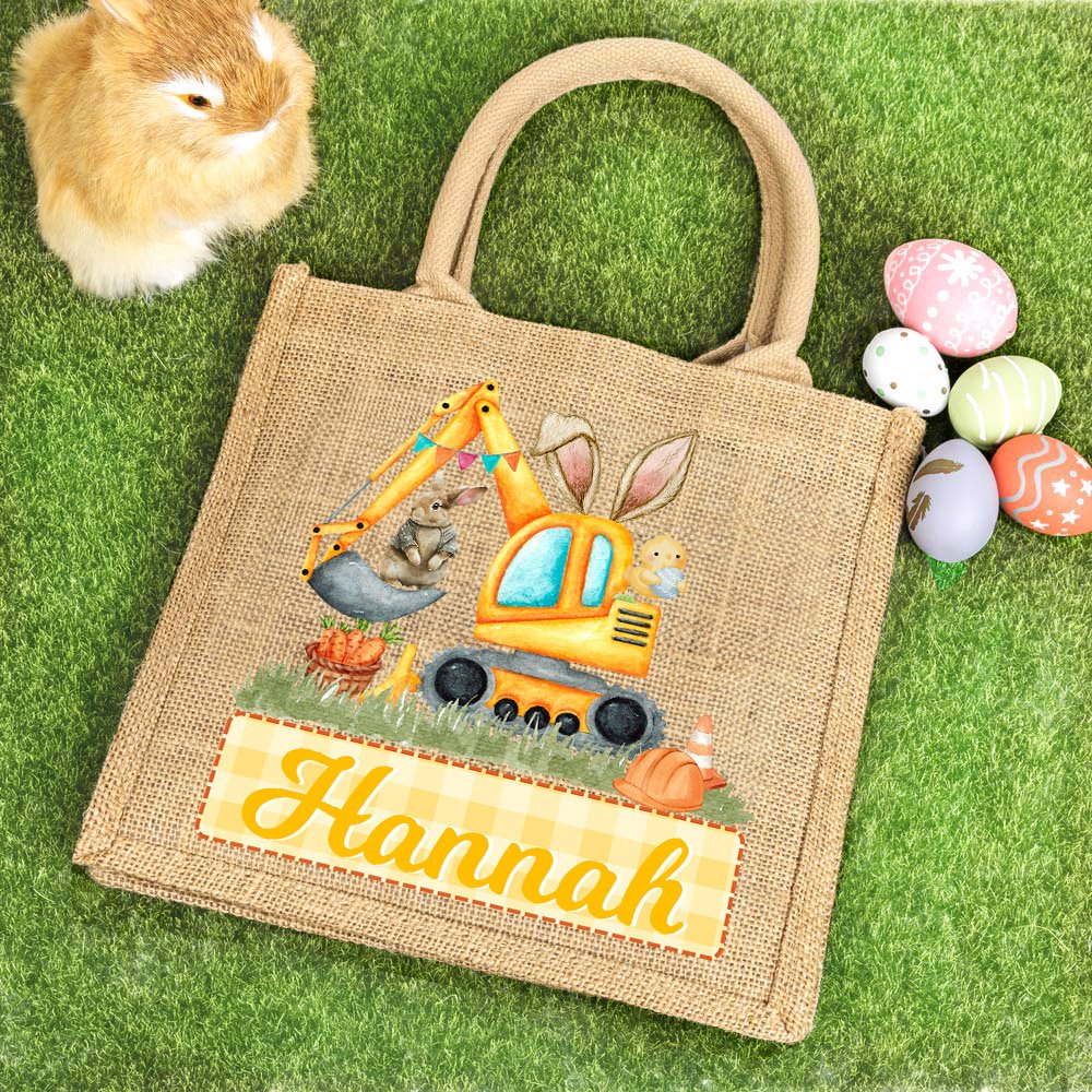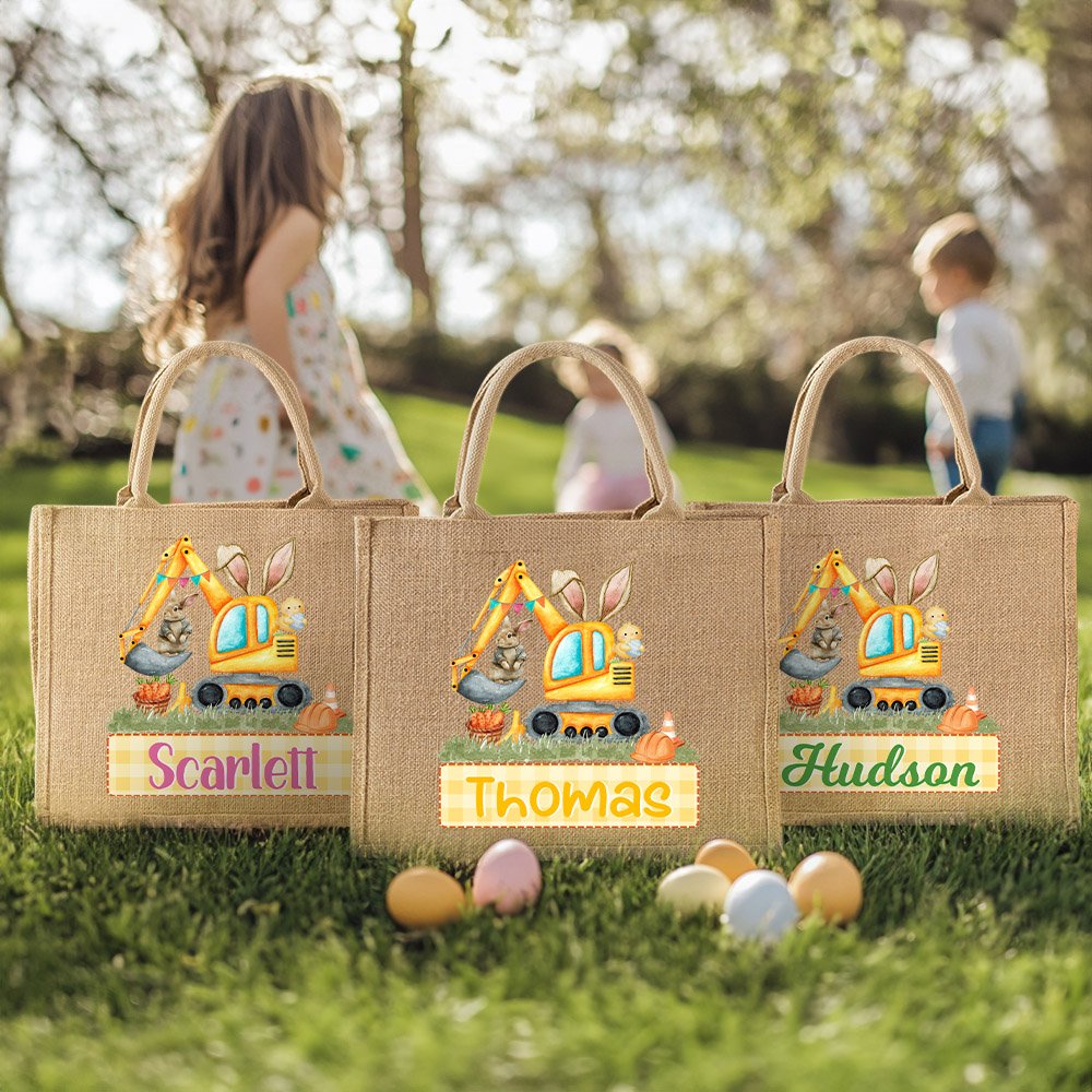 This jute tote features an adorable cartoon excavator pattern combined with an Easter bunny, carrots, and grassland elements. The whole design is vibrant, playful, and childlike, which perfectly captures the spirit of the holiday. It is the ideal Easter celebration choice for boys and girls.