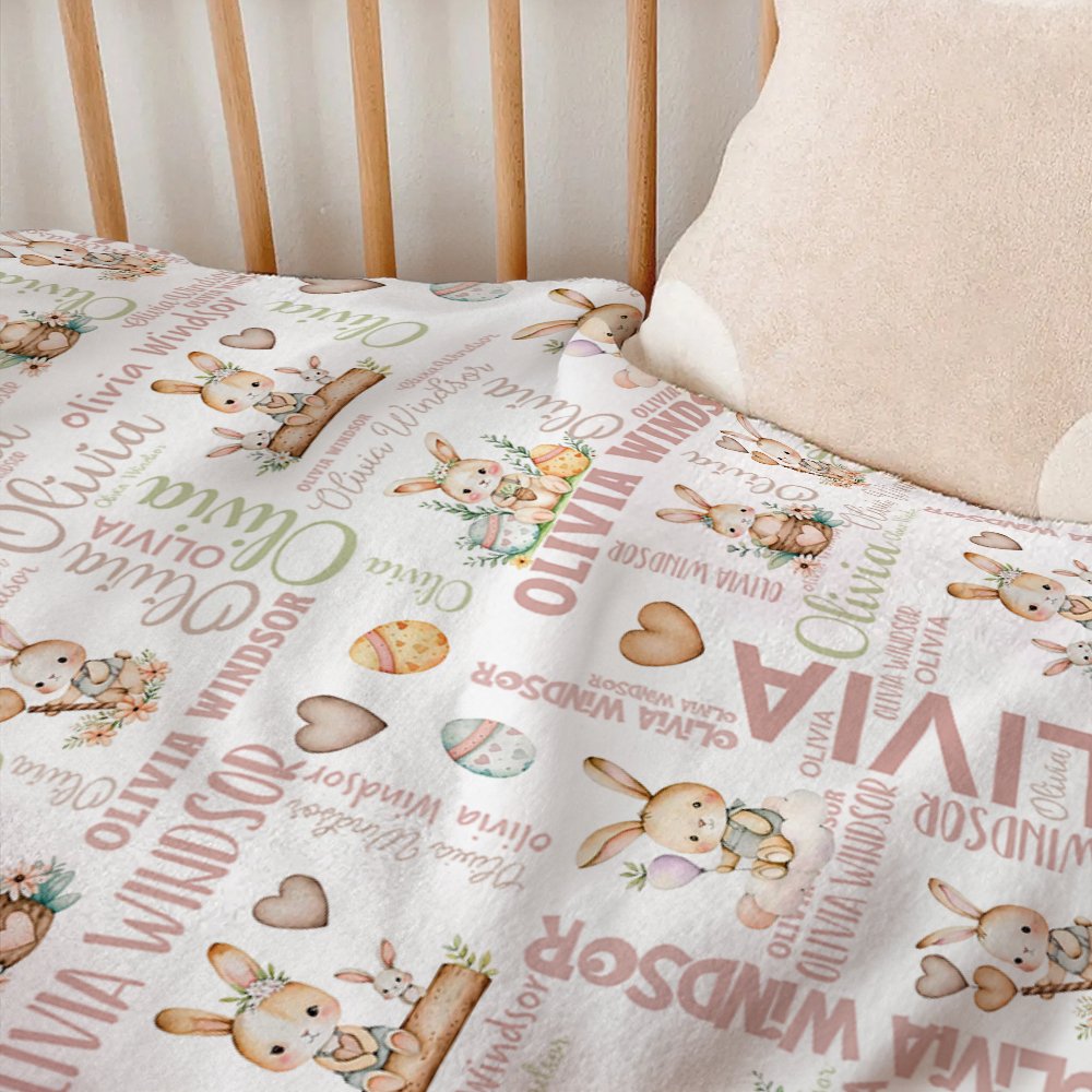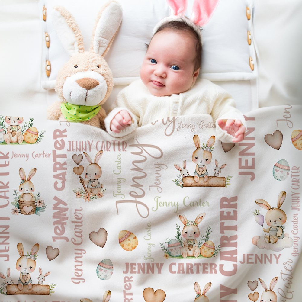 This blanket features an eye-catching design of cute bunnies and word clouds. It can be personalized with a name to make it truly special. It's more than just a blanket, it's a thoughtful expression of your family's love and care.