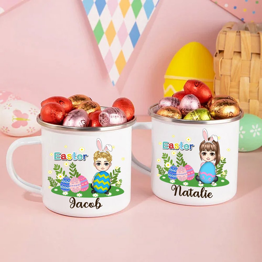 This enamel mug features a fun and festive Easter theme. A cute cartoon character holds a colorful Easter egg, wears bunny ears, and sits on a grassland full of eggs. A customizable name can be added to make it a one-of-a-kind gift. The playful design will bring joy to any child during Easter celebrations.