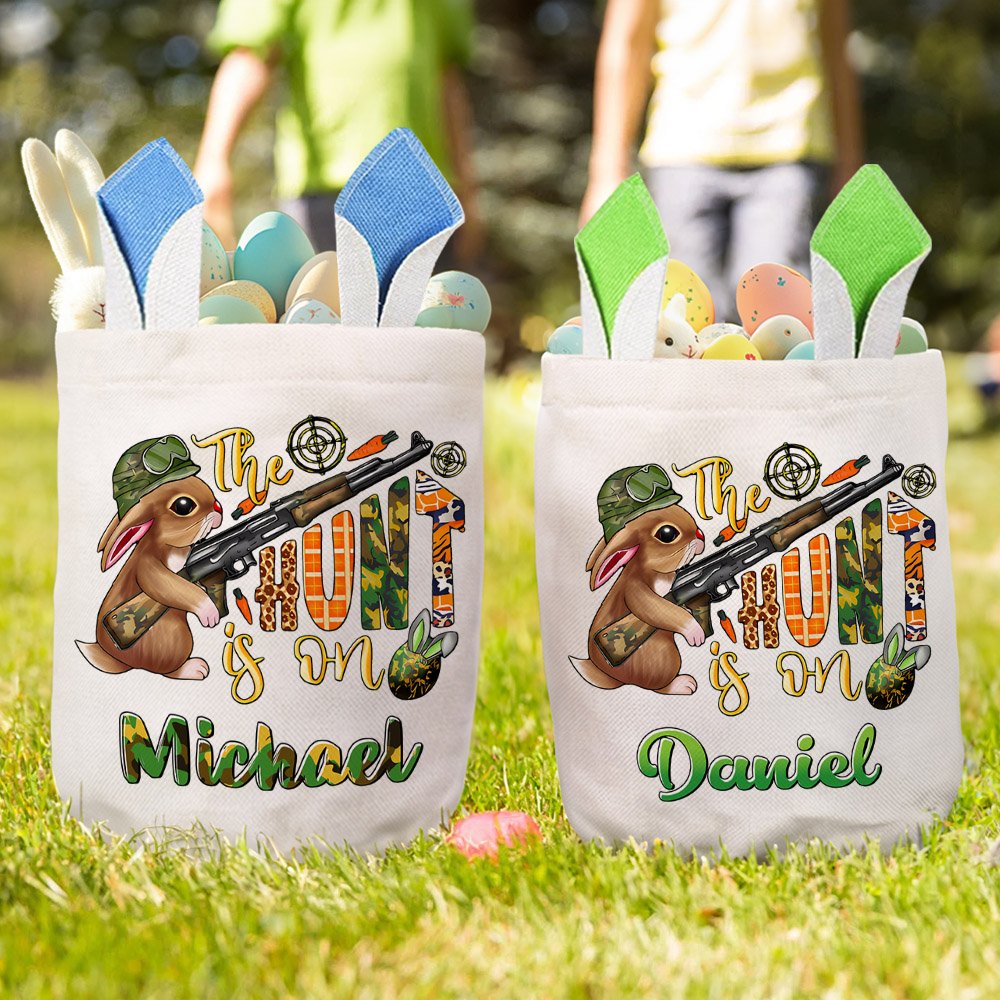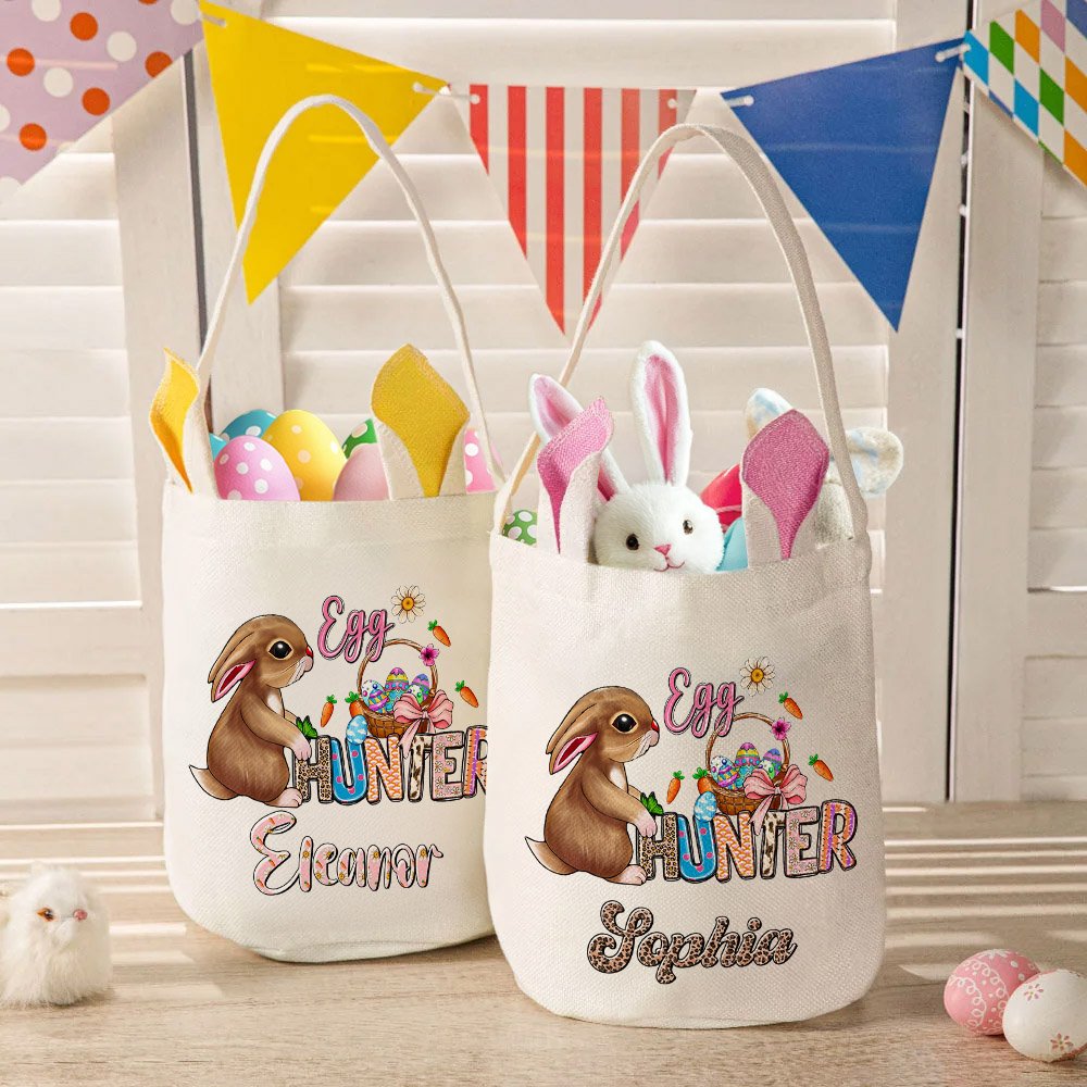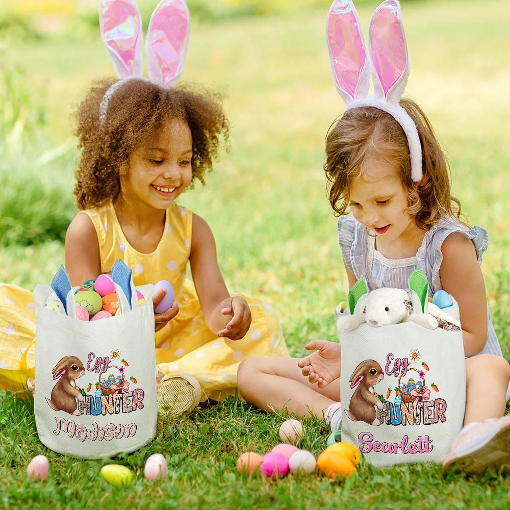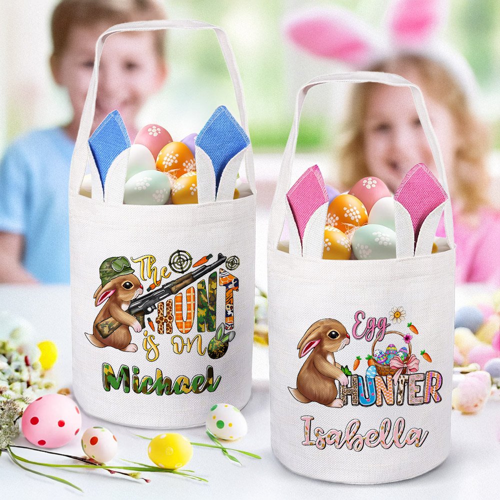 This Easter basket features a fun Easter egg hunter theme. It features an Easter bunny ears egg basket and a unique Easter egg hunter design that can be customized with a name to make it a one-of-a-kind gift. The playful design will bring joy to any child during the Easter celebration.