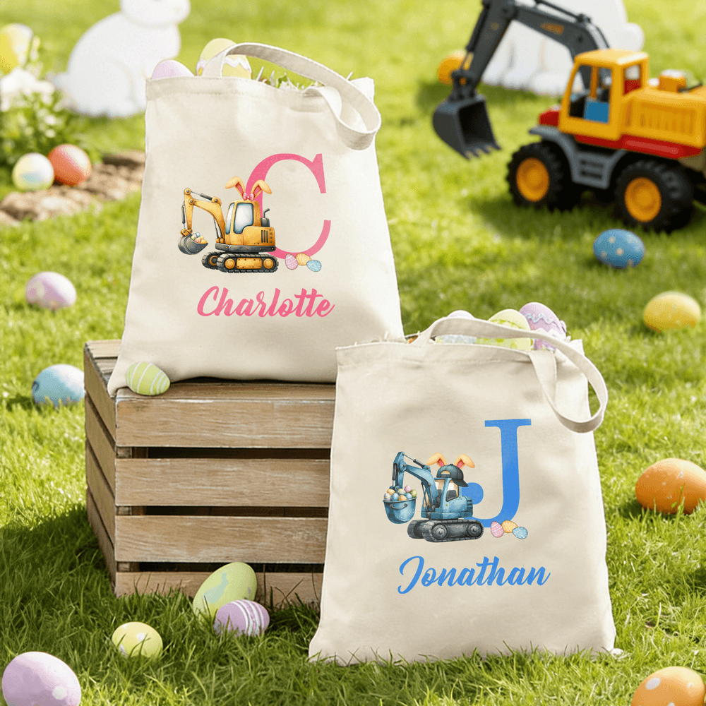 Personalized Cute Excavator Bunny Ears Easter Egg Canvas Tote Bag with Name Daily Use Easter Egg Hunt Gift for Boys Girls