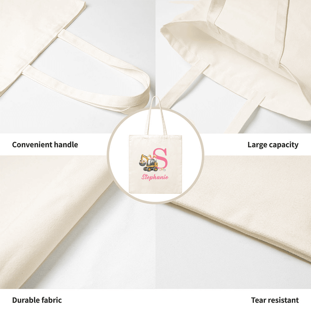 This tote bag features an adorable construction vehicle theme, enhanced with playful bunny ears as decorative elements. The unique aspect lies in its personalization options, allowing you to choose colors that suit your preferences and add your child's name along with their initials. This design beautifully showcases each child's individuality, making every bag a one-of-a-kind piece of art, filled with whimsy and creativity.