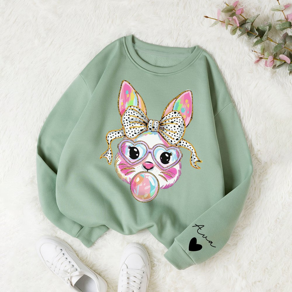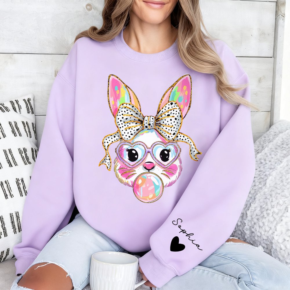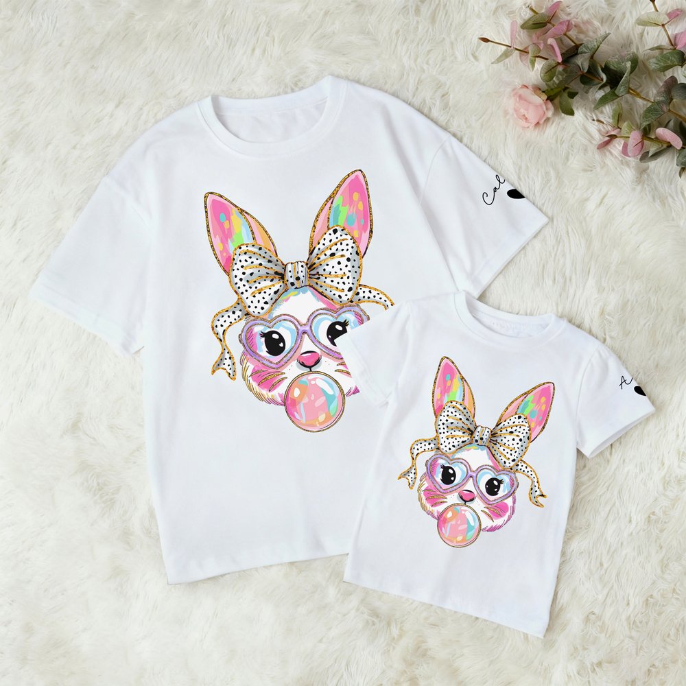 This outfit features a playful Easter bunny with bubblegum gum, heart-shaped glasses, and sparkly embellishments. Available in adult and children's sizes, it also allows for name customization, making it a cute and harmonious choice for both Easter-themed looks and casual everyday wear.
