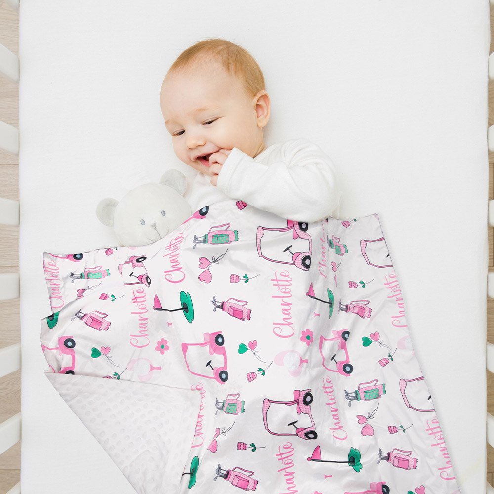 Our blanket is printed with pink golf elements such as clubs, holes, etc. You can customize the recipient's name to add a personal touch and create a unique blanket.