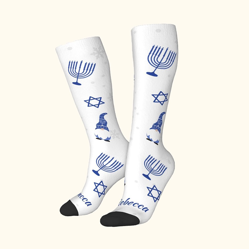 These custom socks make a delightful and practical gift for Jewish family members and friends. It is a unique way to spread warmth and cheer during the Festival of Lights.