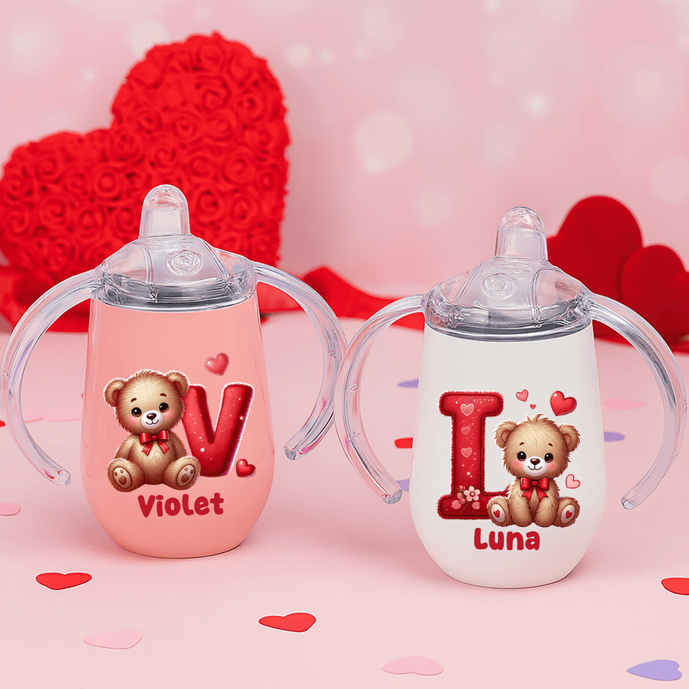 Personalized Cute Heart Bear 10 oz Thermal Insulated Sippy Cup with Name and Initial Birthday Valentine's Day Gift for Children