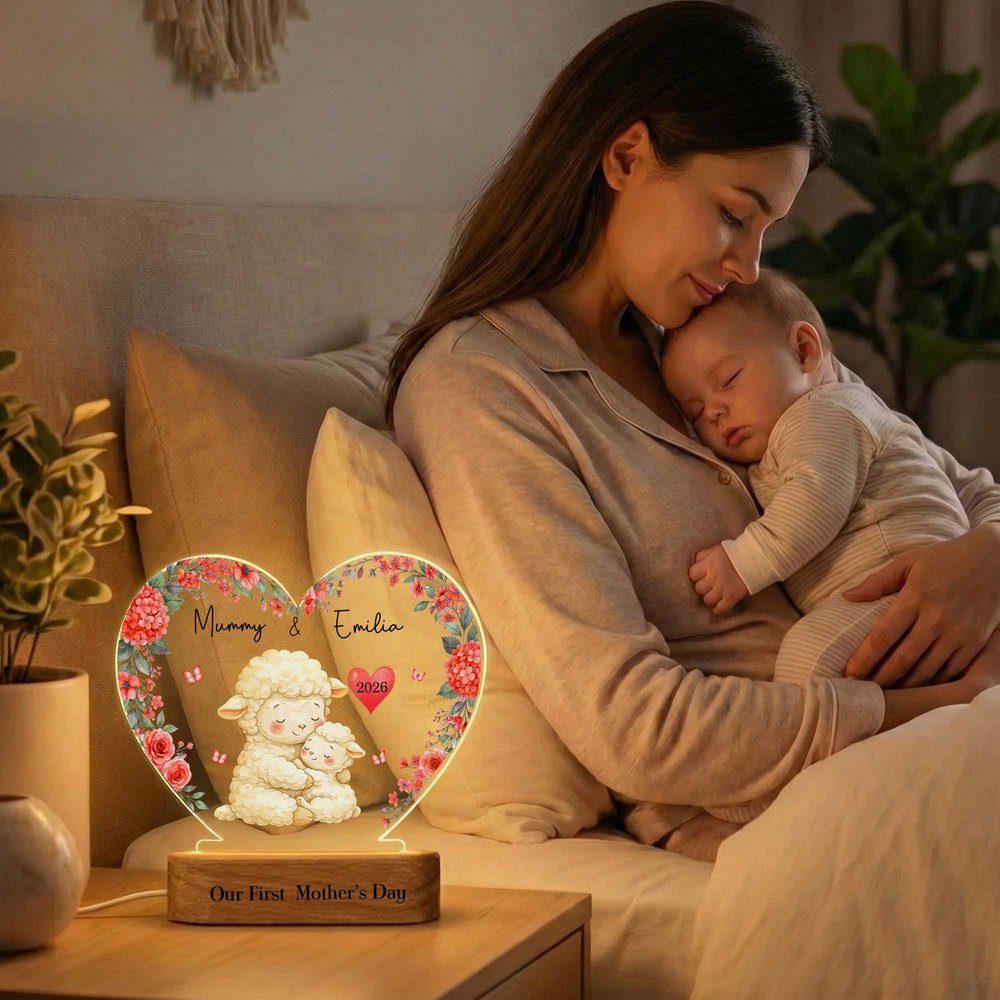 This charming nightlight features an adorable heart-shaped acrylic panel adorned with cute mother-and-baby animal patterns, symbolizing the deep love between a new mother and her baby. The soft and lively illustrations create a warm and gentle atmosphere, a sincere tribute to maternal love. Personalization adds a touch of exclusivity—add the mother's and baby's names. Elegant floral elements are subtly integrated into the design, enhancing its emotional impact and making it a work of art that combines beauty and meaning.