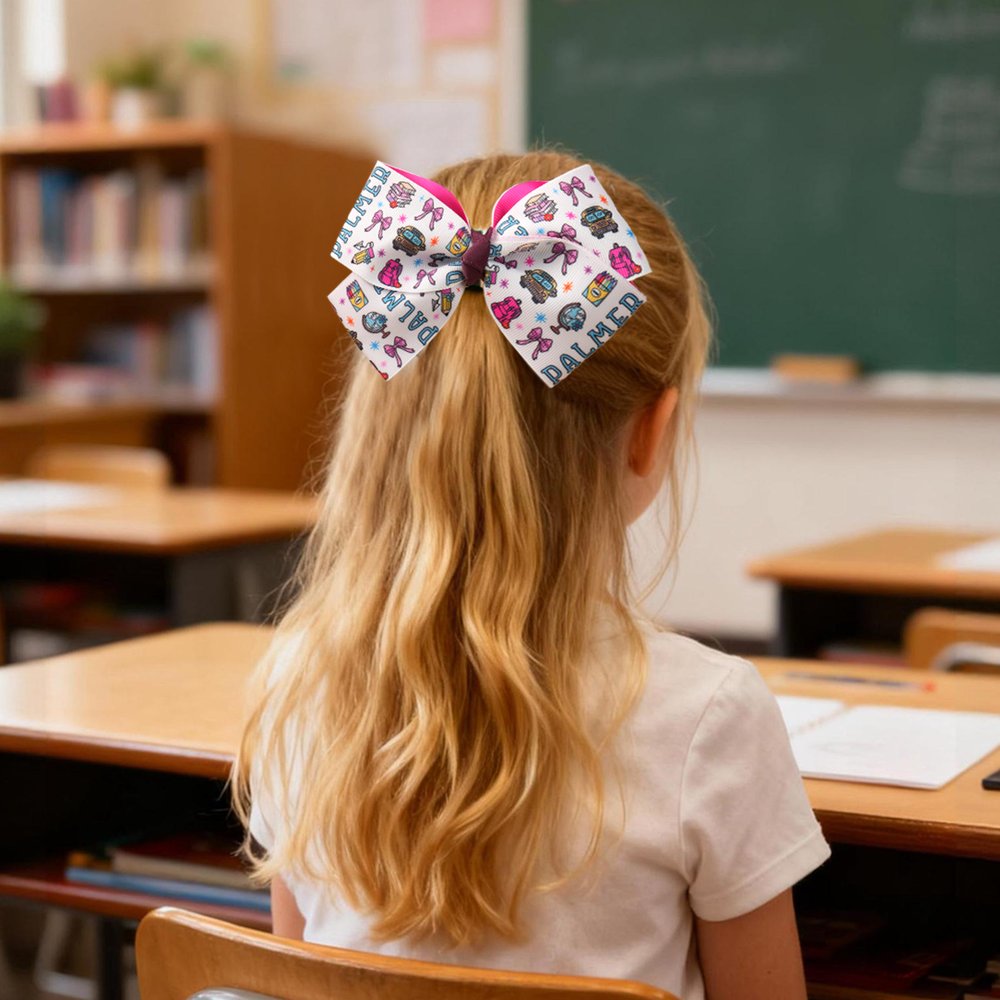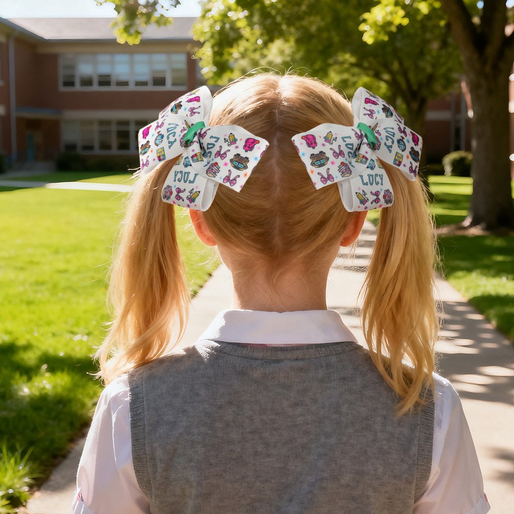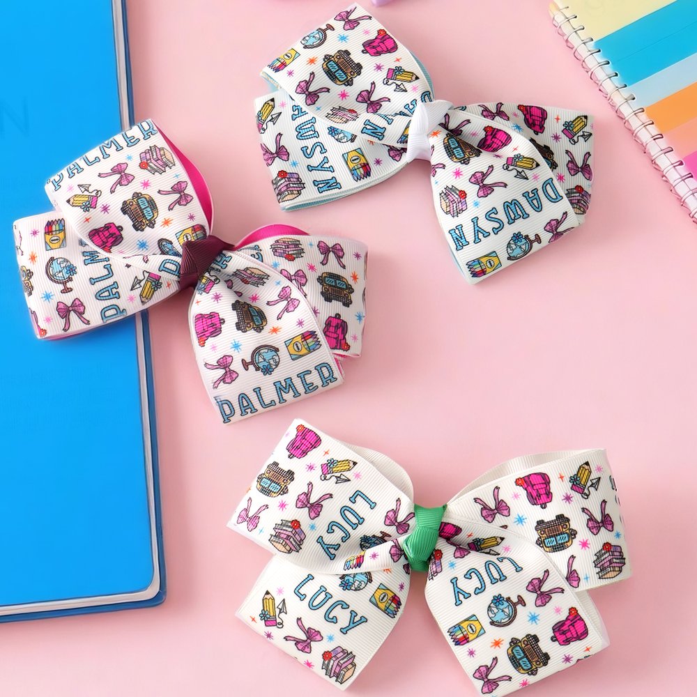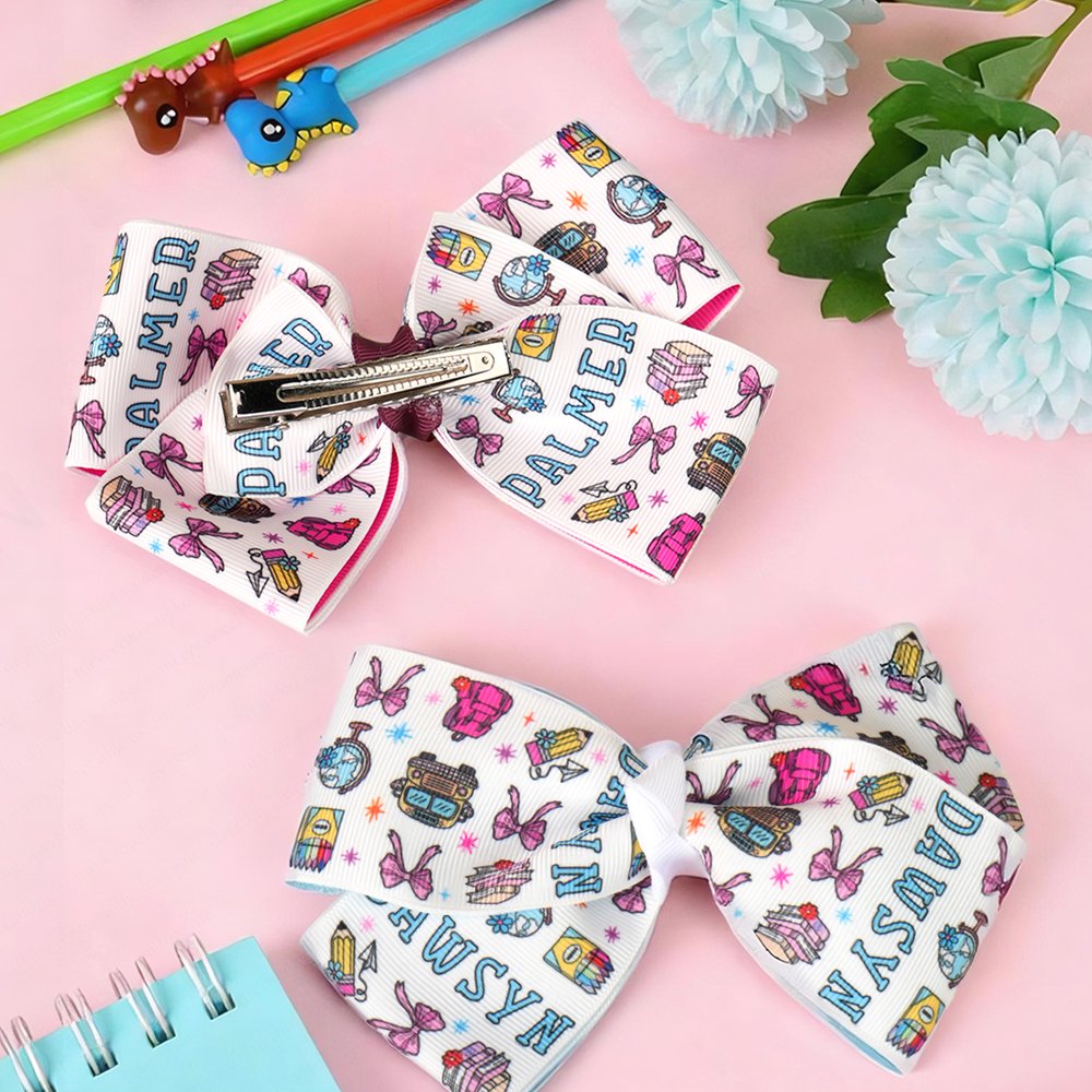 This bow hair accessory features playful school-themed patterns, including notebooks, pencils, crayons, school buses, globes, and backpacks. It can be customized with your child’s name, creating a one-of-a-kind piece that’s both charming and meaningful.