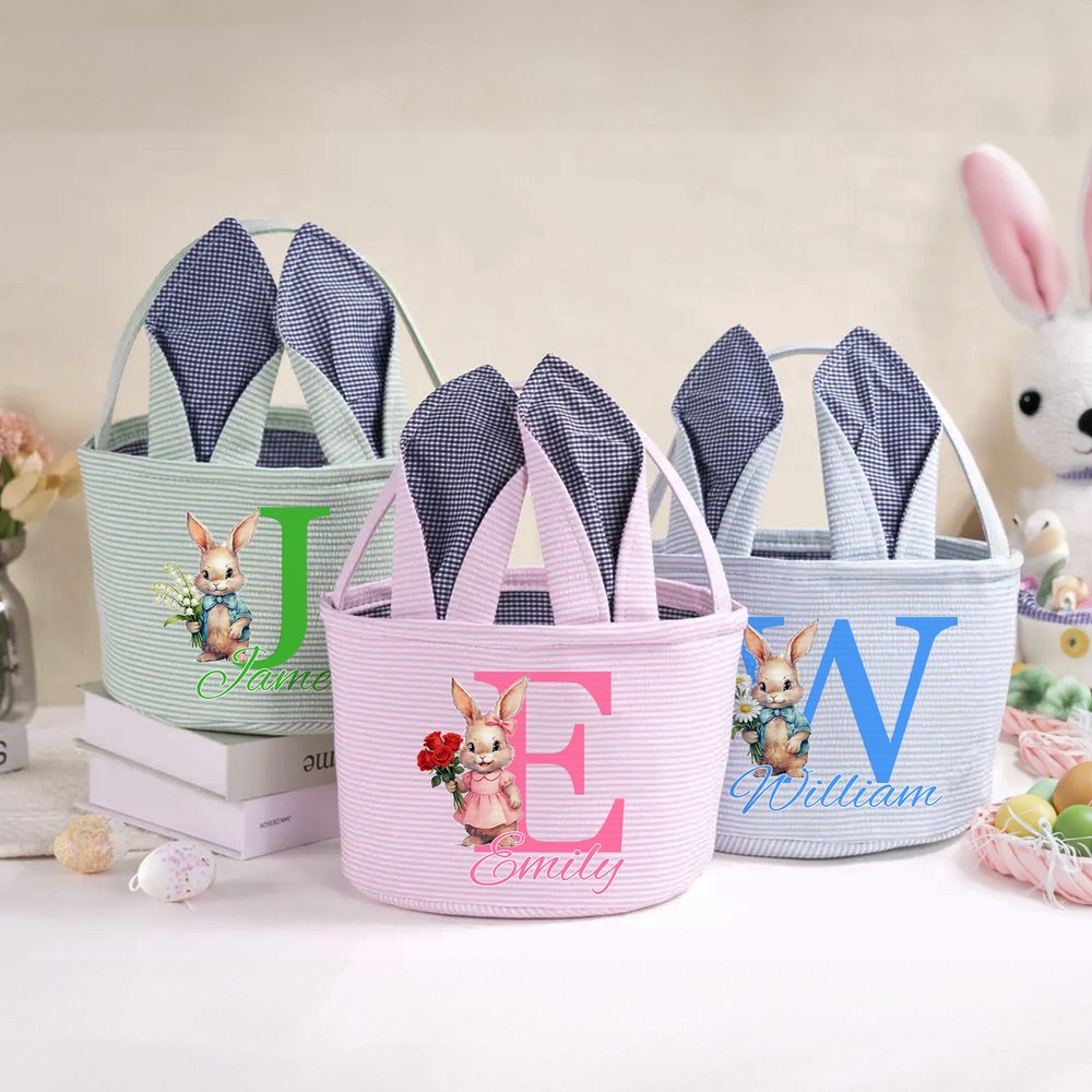 This Easter basket is themed around a playful rabbit and birth flower pattern, paired with customizable initials, making each basket a unique and personal gift for children. The design is full of childlike charm, with soft color combinations creating a warm and festive springtime Easter atmosphere.