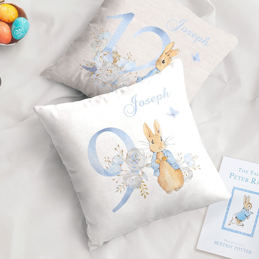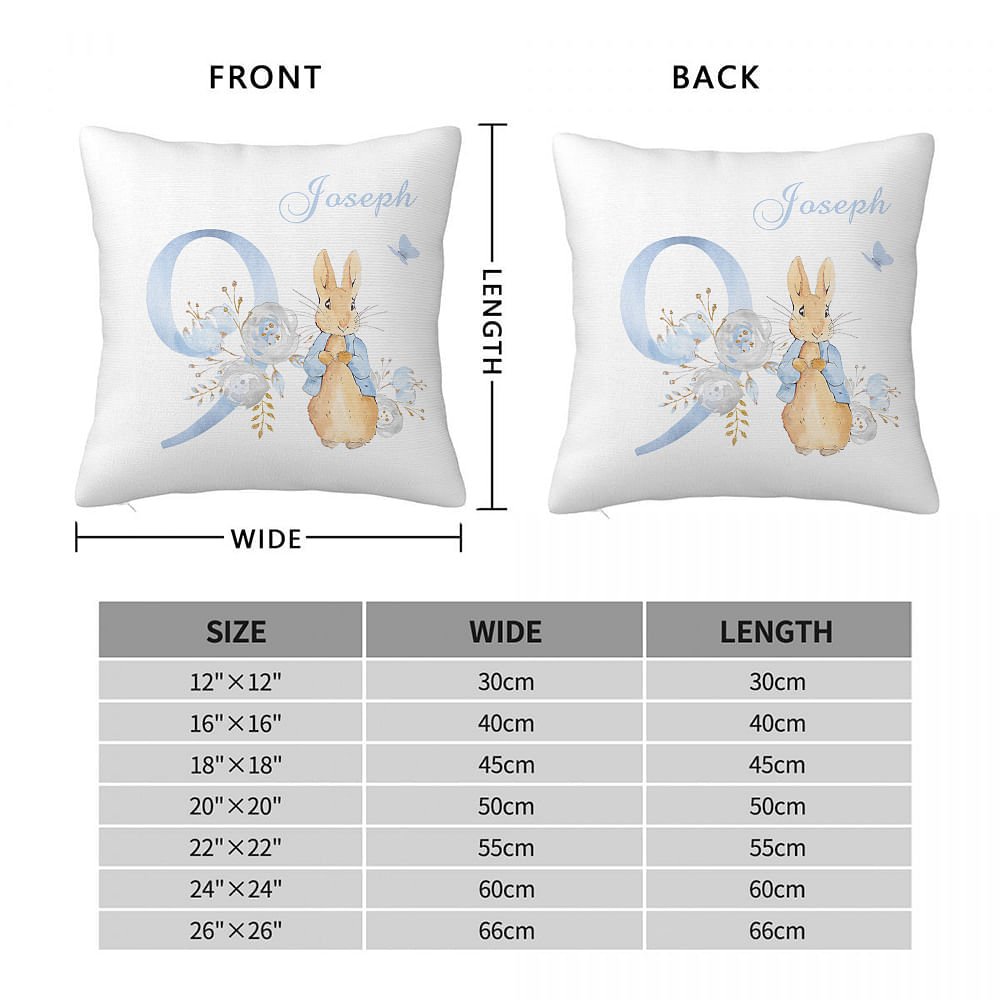 Personalized Cute Peter Rabbit Bunny Floral Throw Pillow Cover with Birth Month and Name Nursery Decor Baby Shower Birthday Gift for Boys Girls