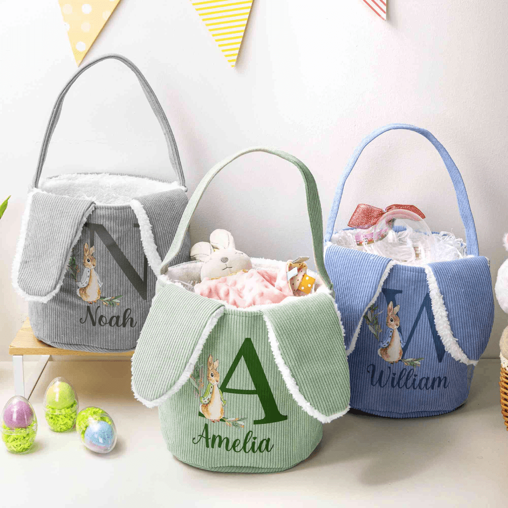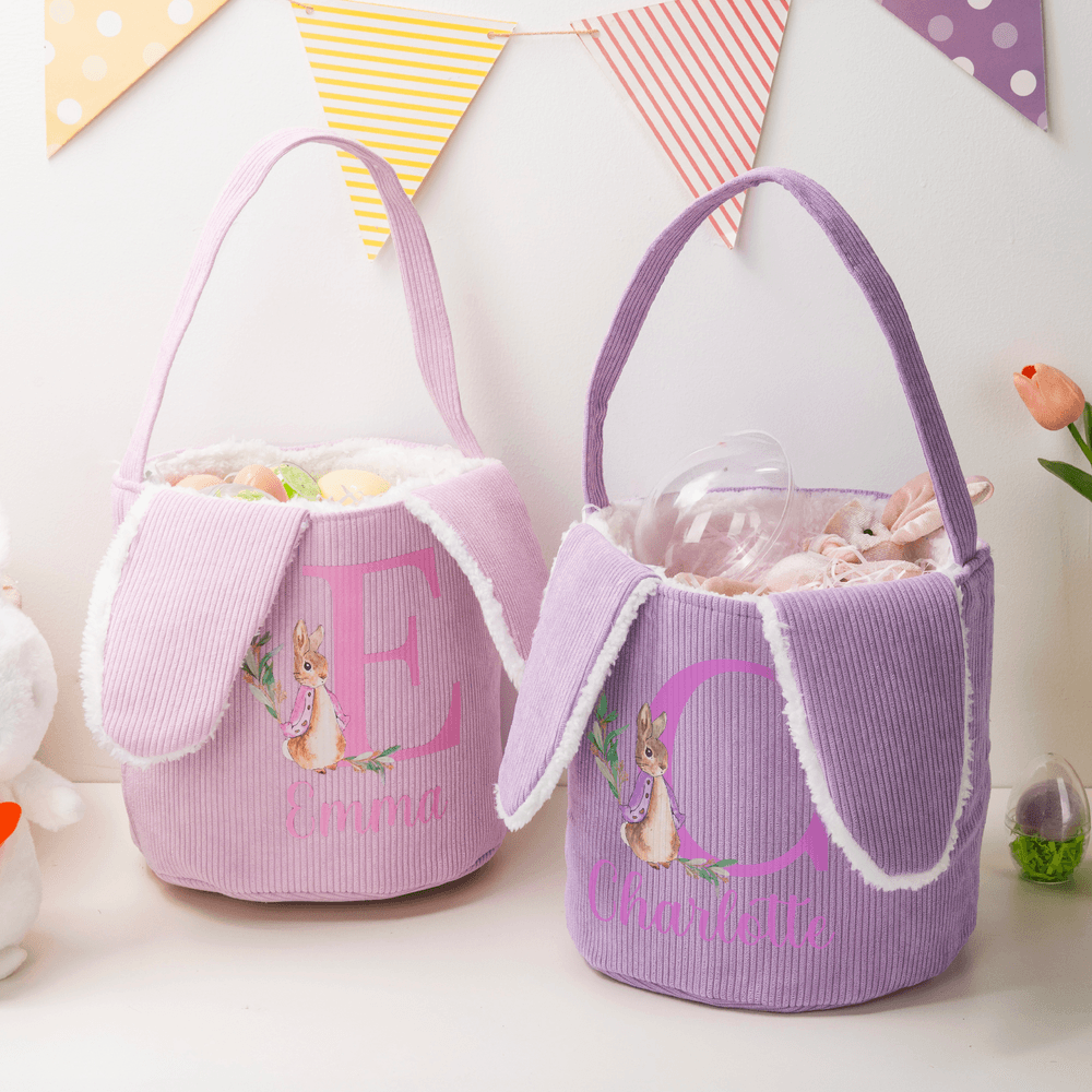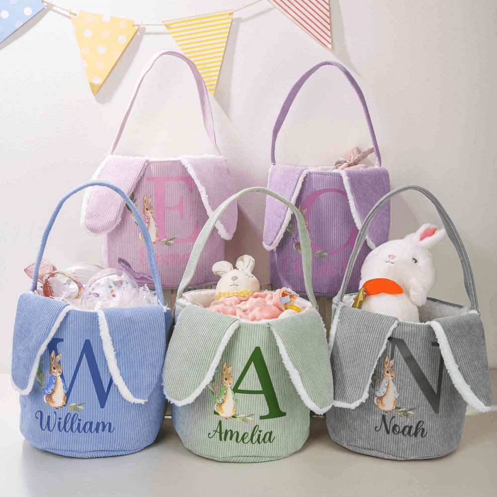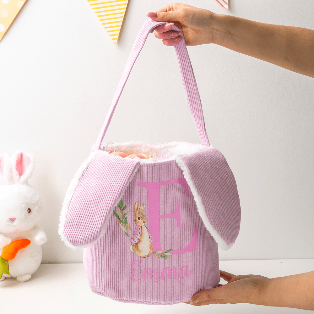 Personalized Cute Peter Rabbit Corduroy Easter Basket with Name and Initial Outdoor Activities Easter Egg Hunting Gift for Kids