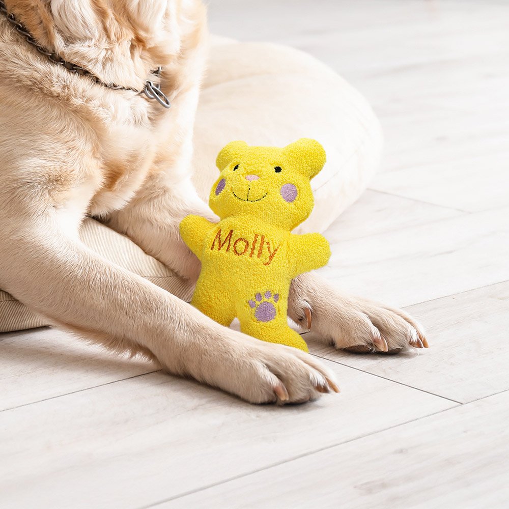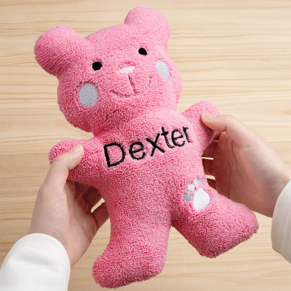 Our plush toys are designed in a cute bear shape and come in various colors, making them delightful companions for your furry friends. Each toy can be personalized with an embroidered name, creating a unique keepsake for every pet lover.
