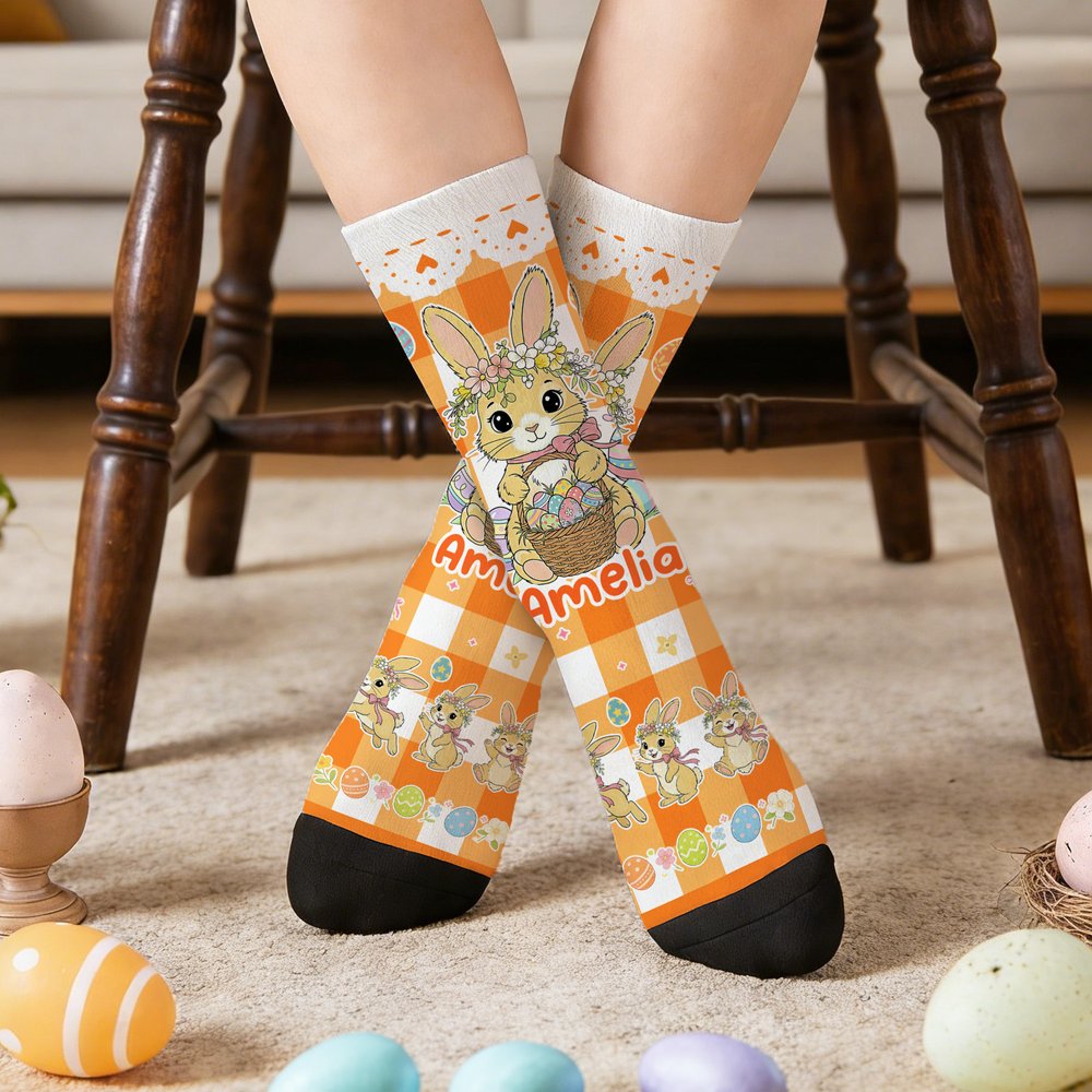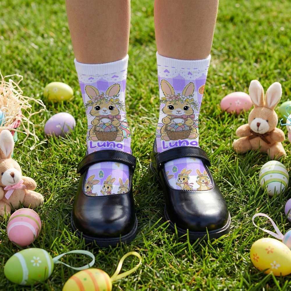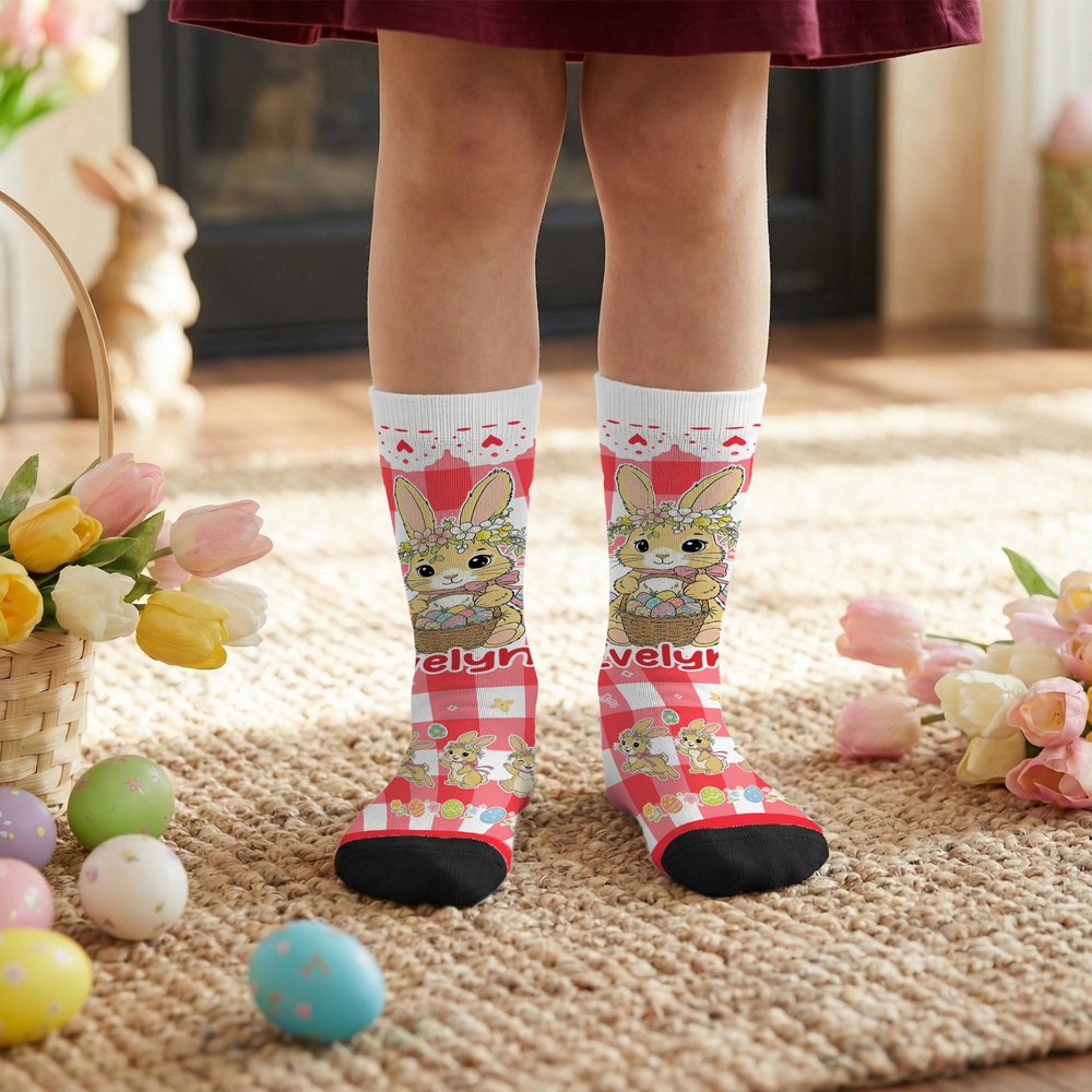 Personalized Cute Wreath Bunny Plaid Soft Kid Adult Mid-Calf Socks with Name Daily Wear Easter Gift for Kids Family