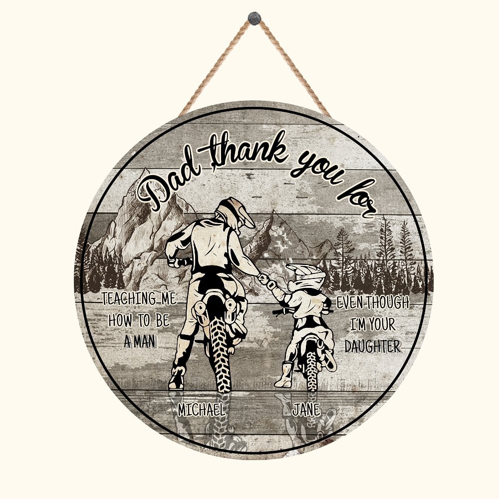 • Stylish Design: Our dad decor sign printed dad and daughter riding motorcycles together and with the saying "Dad, Thank You For Teaching Me How To Be A Man, Even Though I'm Your Daughter". It is a perfect Father's Day gift from daughter.