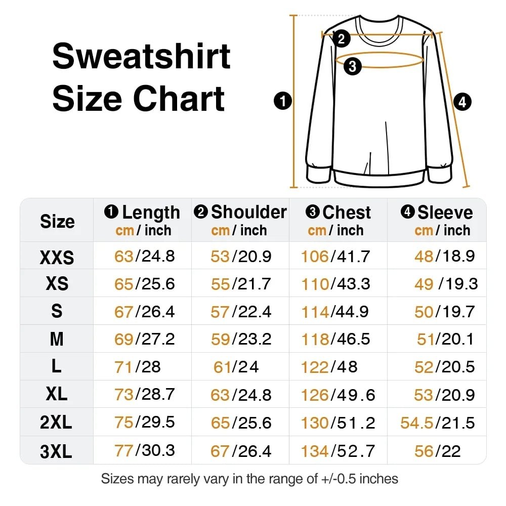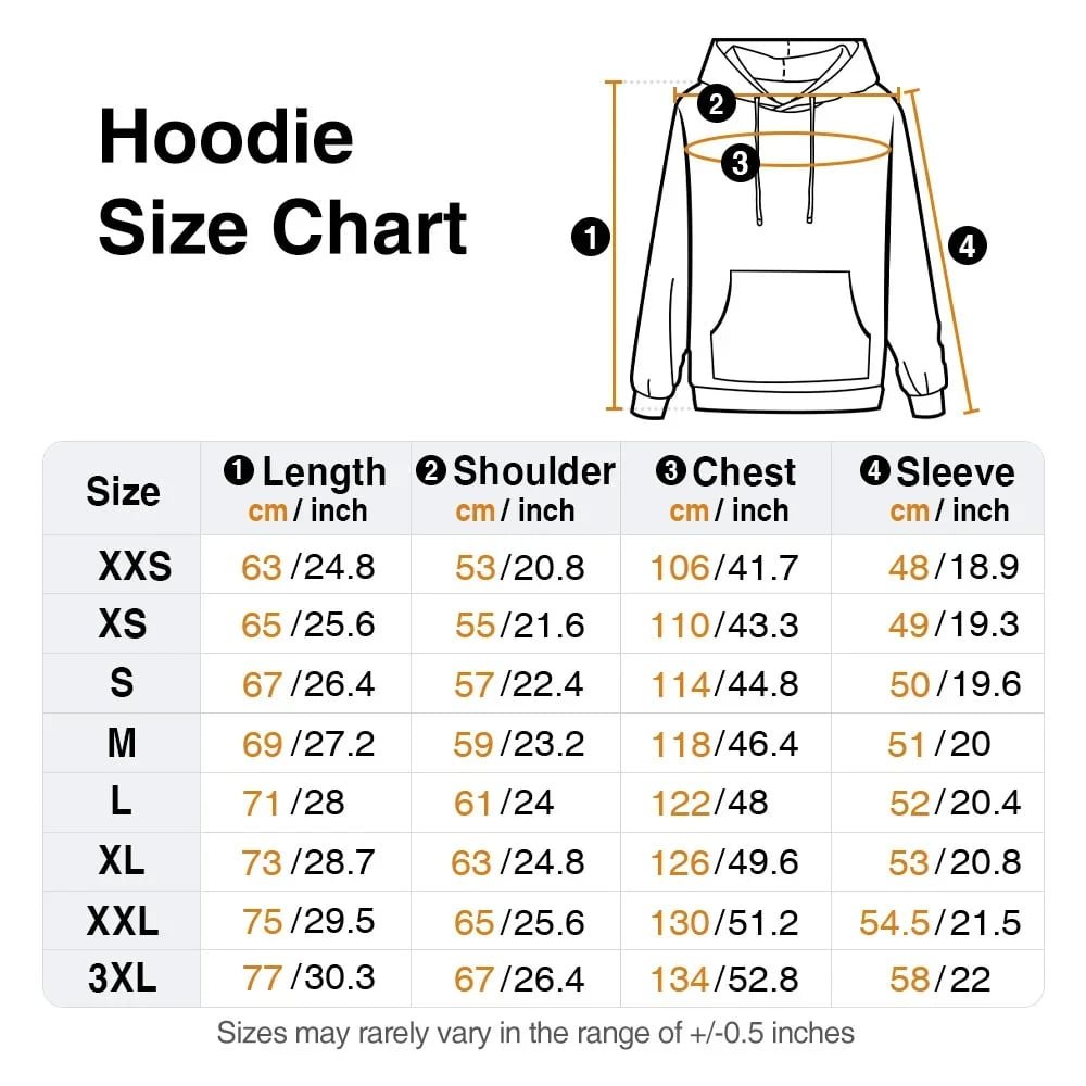 | Measurement: | T-shirt - XXS, XS, S, M, L, XL, 2XL, 3XL, 4XL, 5XL Sweatshirt - XXS, XS, S, M, L, XL, 2XL, 3XL Hoodie - XXS, XS, S, M, L, XL, XXL, 3XL |