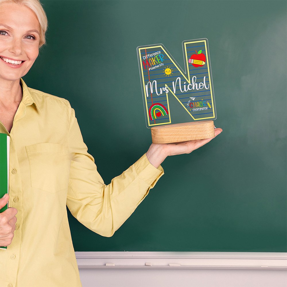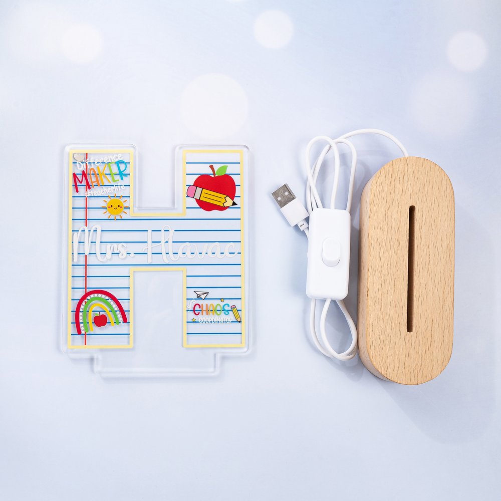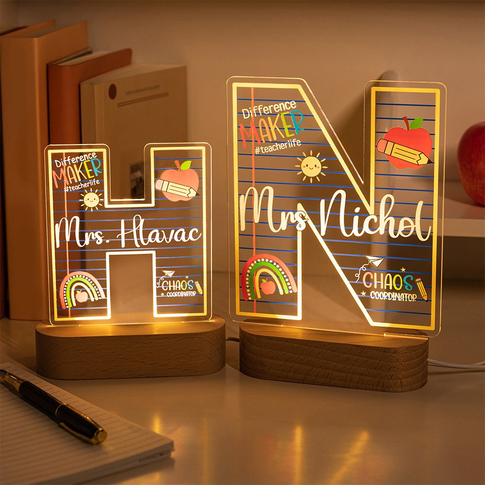 This night light is themed with teachers, and the initials of acrylic can be customized. The words Difference Maker and Chaos Coordinator on the night light provide fun, and the teacher's name or title can be customized. The unique shape and soft and soothing colors create a peaceful atmosphere and add a touch of warmth.