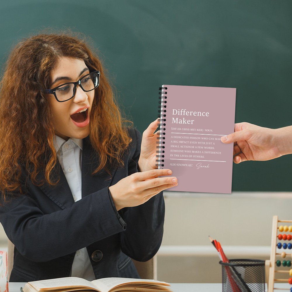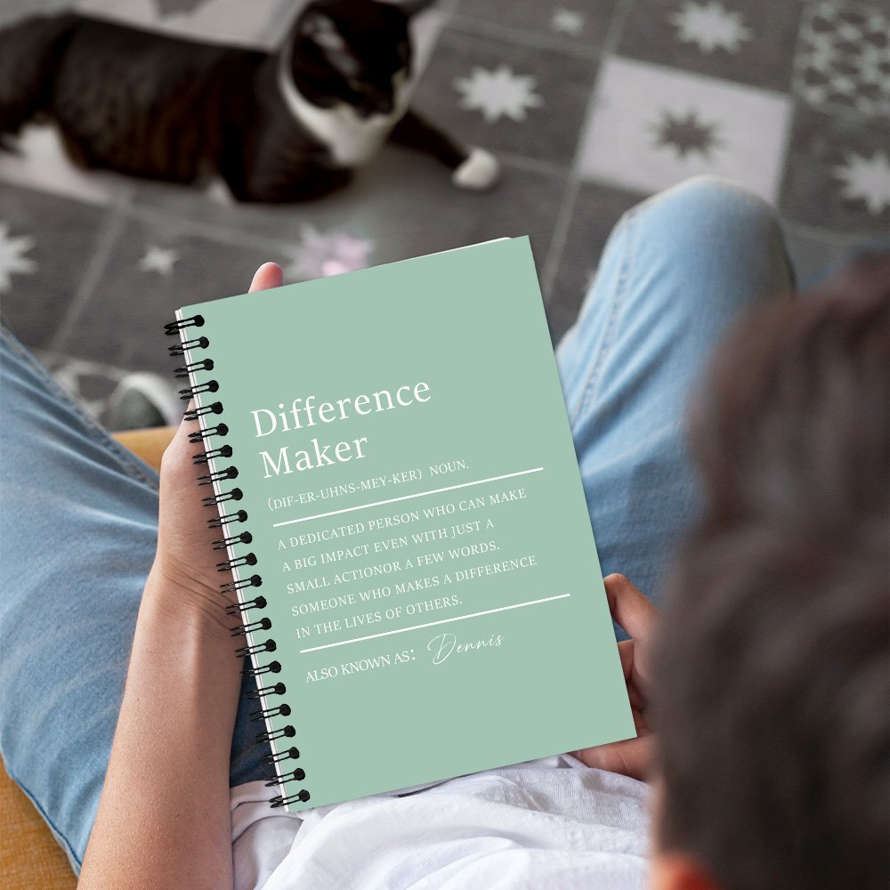 The cover is printed with the words "Difference Maker" and a detailed definition describing a dedicated person who can make a big impact even with a small action or a few words. This design is beautiful and serves as a source of inspiration and motivation. The personalized name design gives this difference maker a concrete form.
