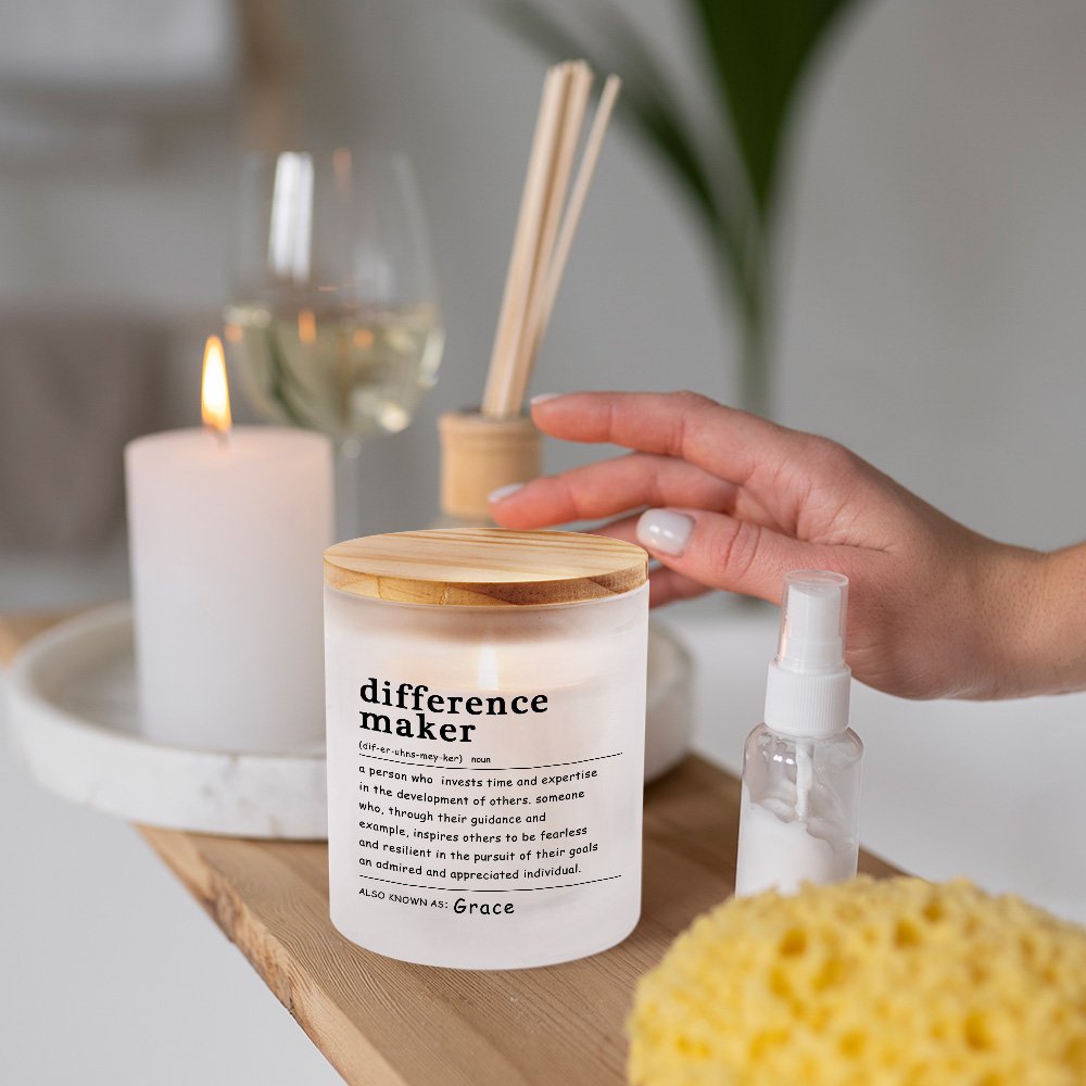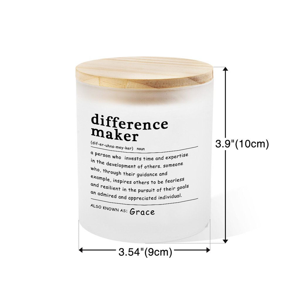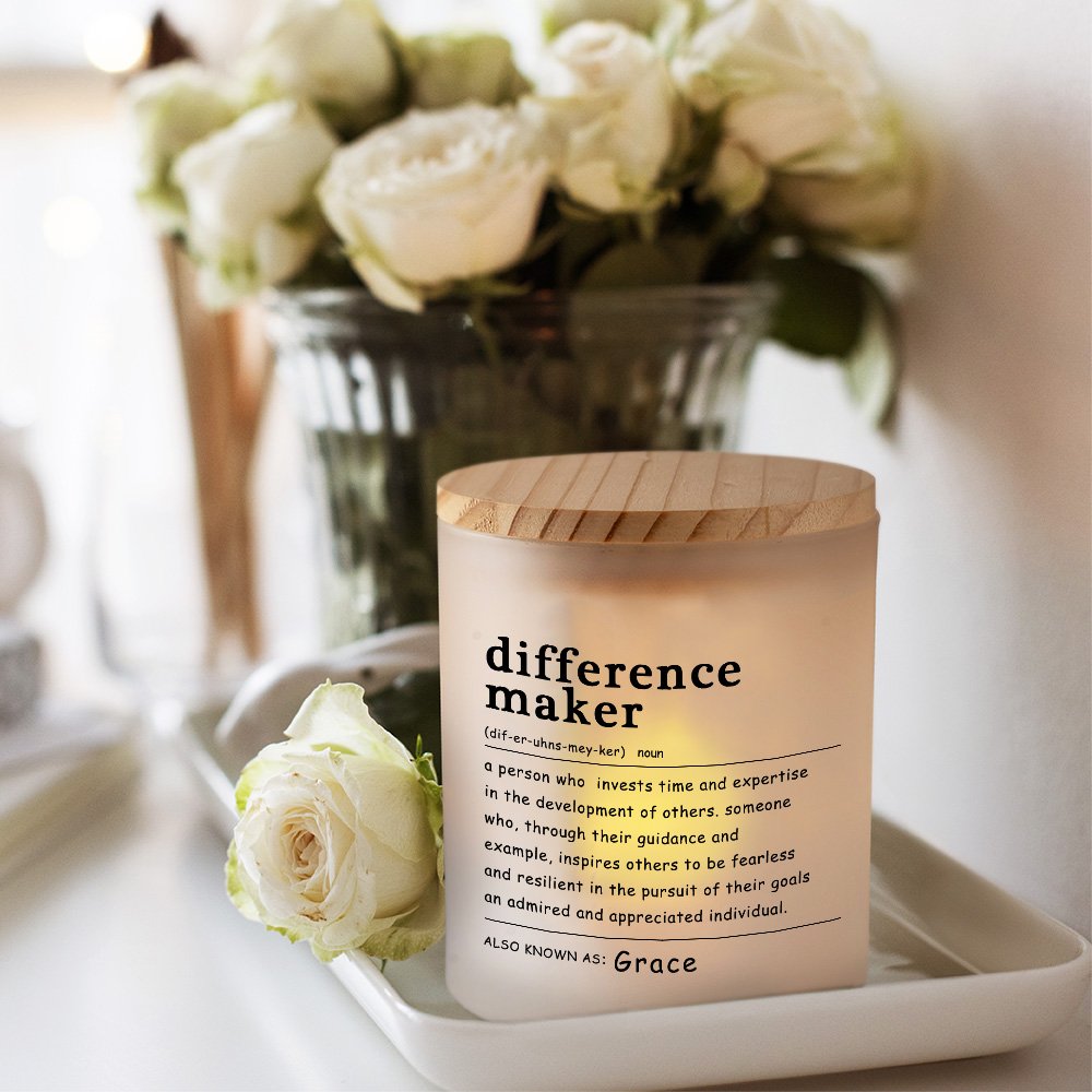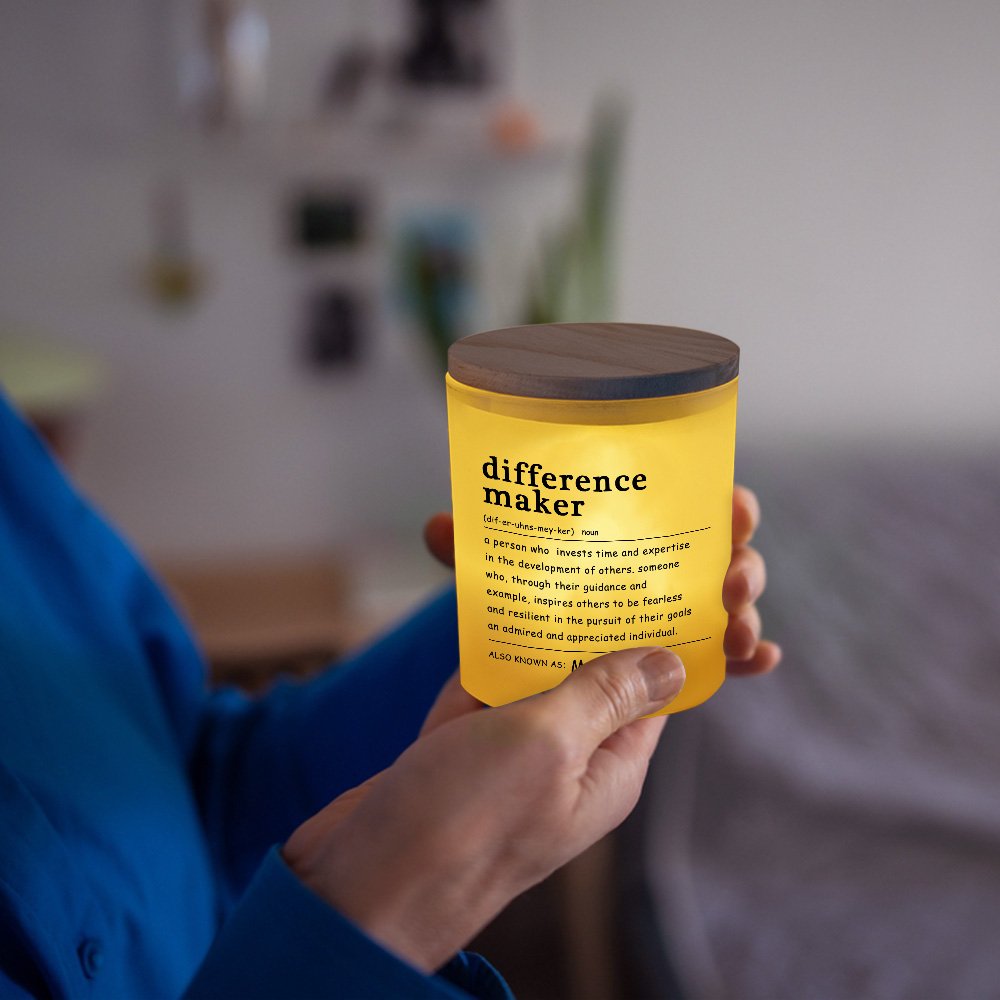 This LED candle lamp jar features the word "Difference Maker" prominently, along with a detailed definition that describes a person who invests time and expertise in the development of others, inspiring them to be fearless and resilient. The design is not only aesthetically pleasing but also serves as a constant source of inspiration and motivation.