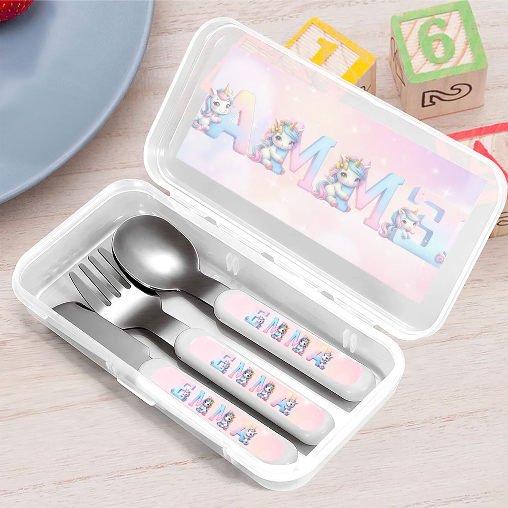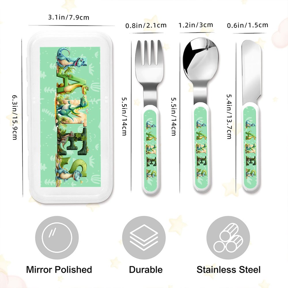 This children's knife, fork, and spoon set features delightful themes of fun dinosaurs and magical unicorns that instantly capture kids' attention, adding endless joy to every meal. You can customize the patterns and names on the handles and the box according to your child's preferences, making each piece a unique treasure.