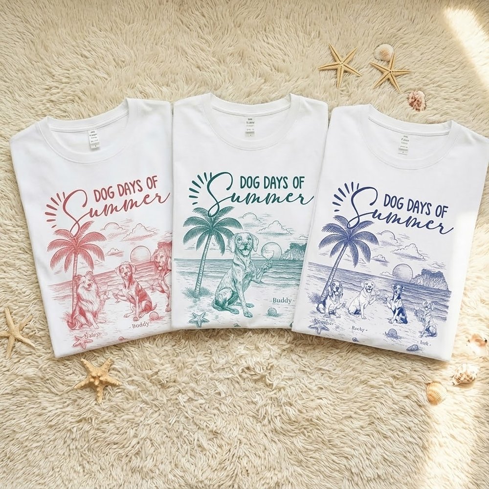 Featuring a summer beach theme, this design allows for customization with 1-5 different dog breeds and their names. The bright and vibrant colors perfectly capture the relaxed summer atmosphere, showcasing the happiness of a multi-pet family by printing your beloved pets on the garment.