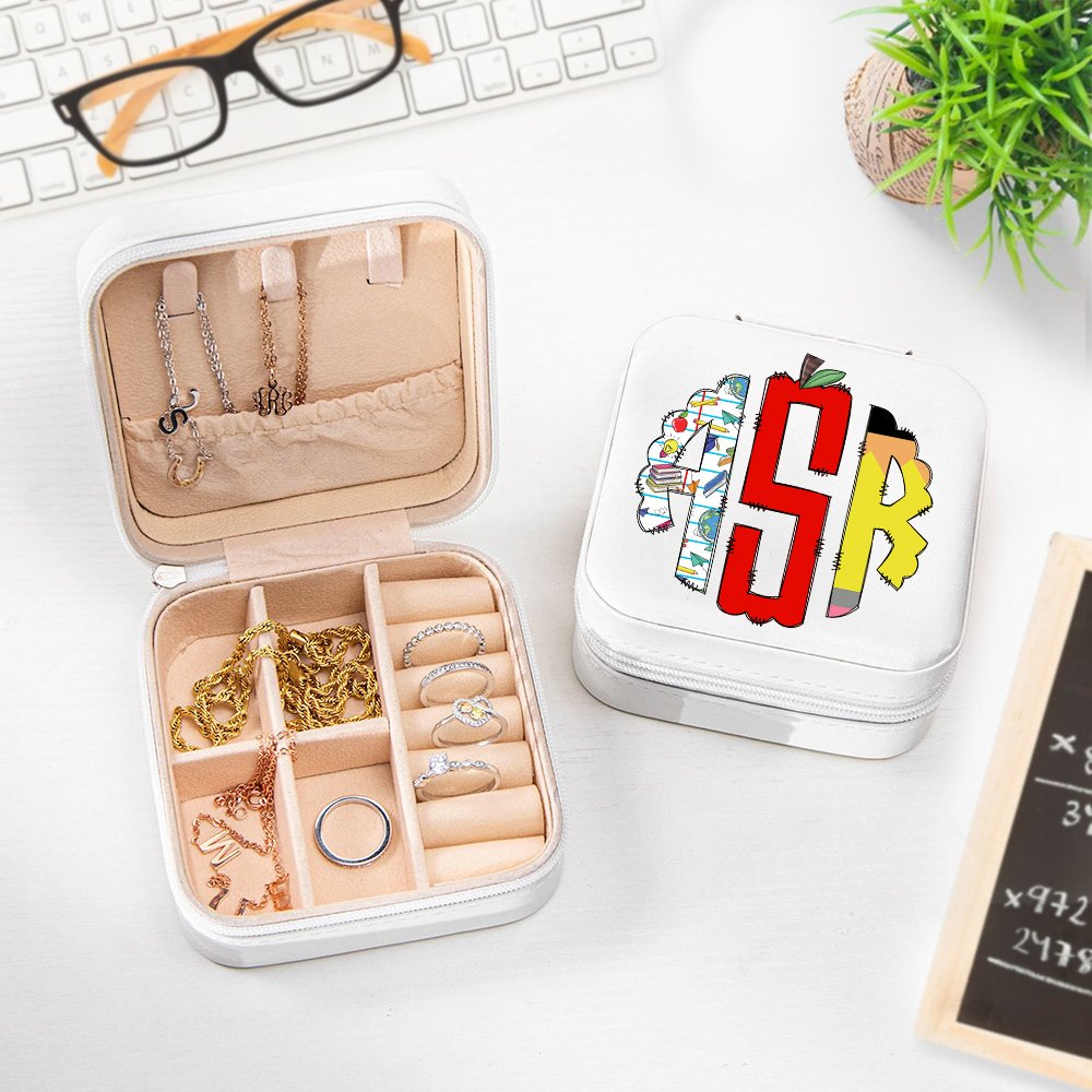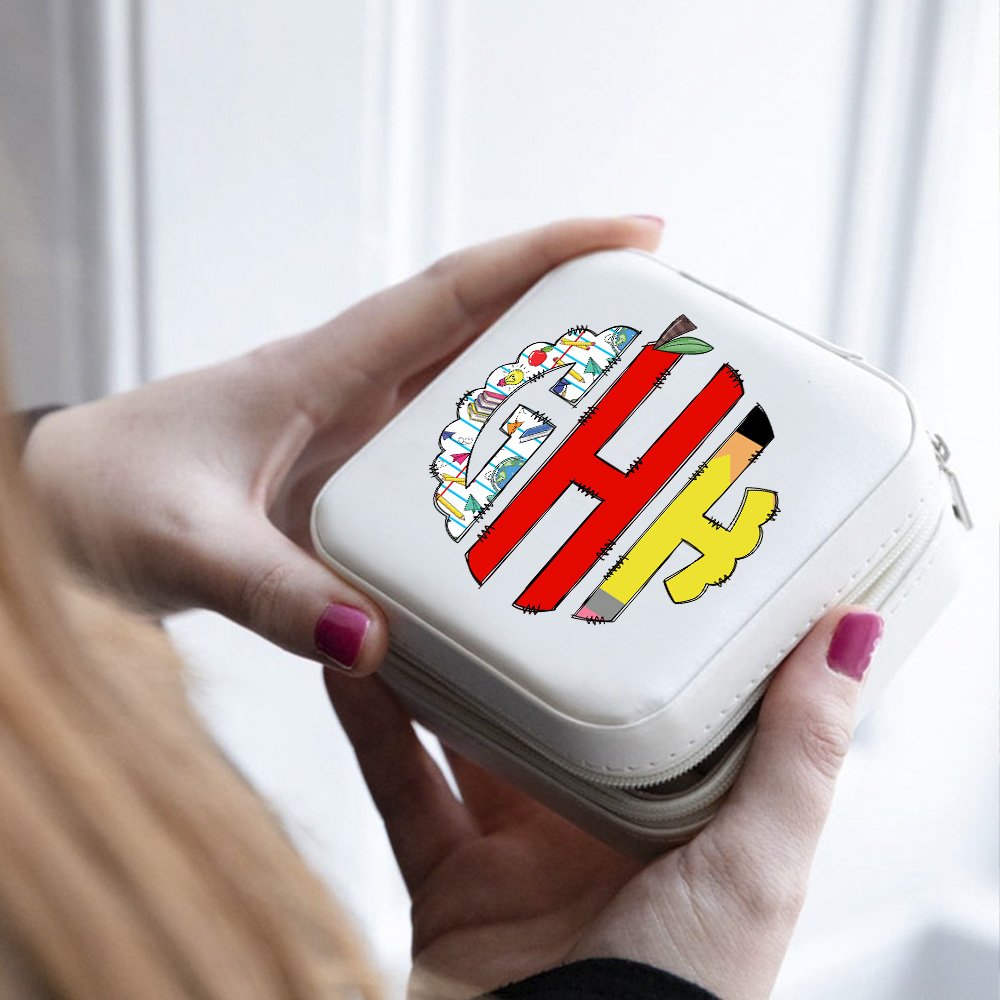 This jewelry case stands out with its charming doodle-inspired monogram design featuring notebook, apple, and pencil elements. Personalize it by choosing three letters to create a truly unique accessory that reflects the teacher's individuality and passion for teaching.