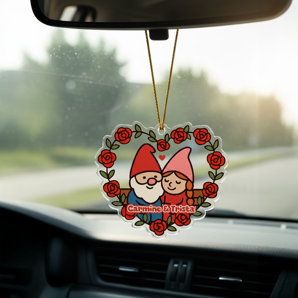 With an ingenious fusion of an enchanting duo of dwarf sweethearts and timeless emblems of love, this ornament unfolds a one-of-a-kind romantic tale. The heart-shaped silhouette embodies profound affection, the vibrant surrounding roses epitomize romance and ardor, and the printed couple's name adds an exclusive touch, rendering it a distinctive love testament. Every minute detail reflects the designer's unwavering attention to intricacy and heartfelt wishes for the relationship.
