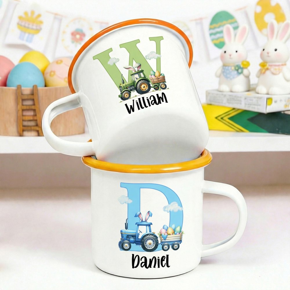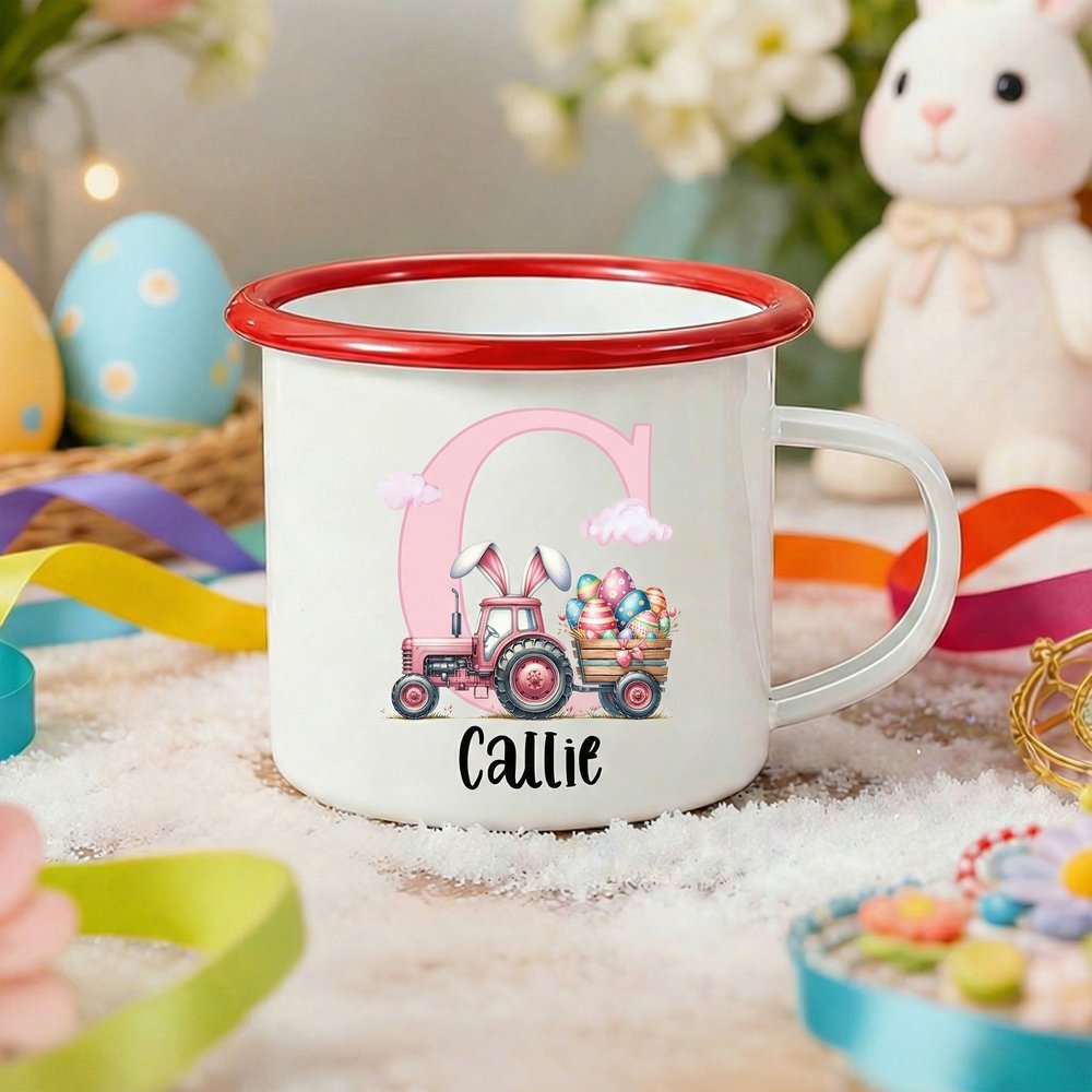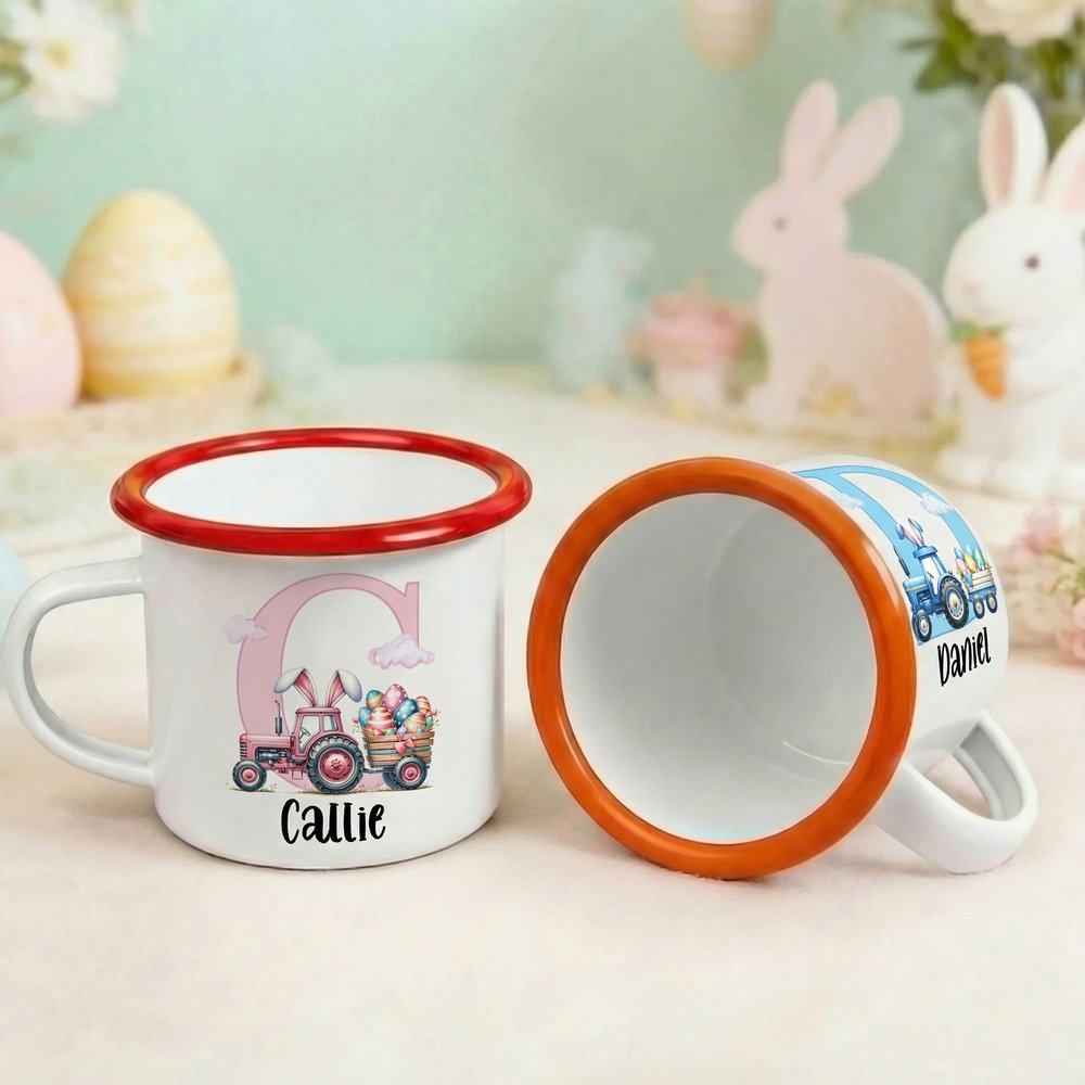 Blending cute tractor patterns with lovely Easter elements, it supports custom name personalization and offers a variety of mug rim color options. The coordinated and playful design transforms an ordinary enamel mug into a festive, one-of-a-kind piece of drinkware.