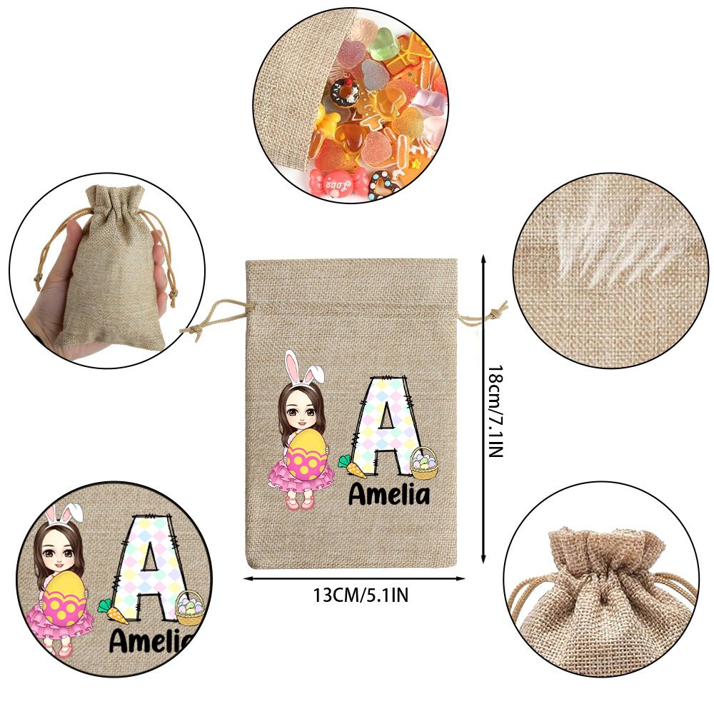 Personalized Easter Egg Cartoon Character Burlap Treat Bag with Name and Initial Easter Eggs Hunting Holiday Party Gift for Boys Girls