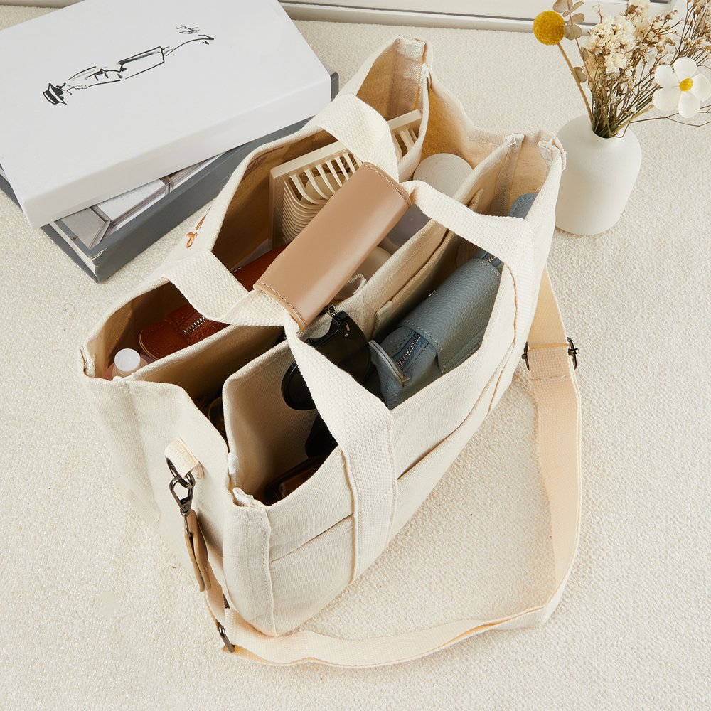 Crafted from sturdy canvas, the bag balances durability, lightweight design, and timeless style. Canvas is tear-resistant and easy to clean. The fabric’s natural texture feels casual yet polished, while reinforced stitching ensures it holds up to daily wear. The leather-accented handle and adjustable strap add a touch of refined detail without sacrificing practicality.