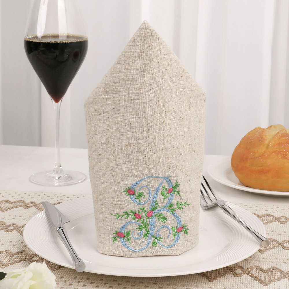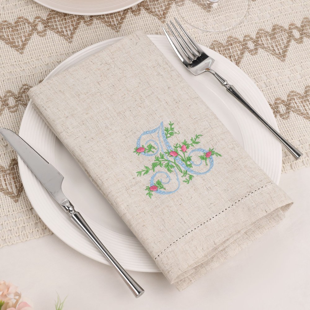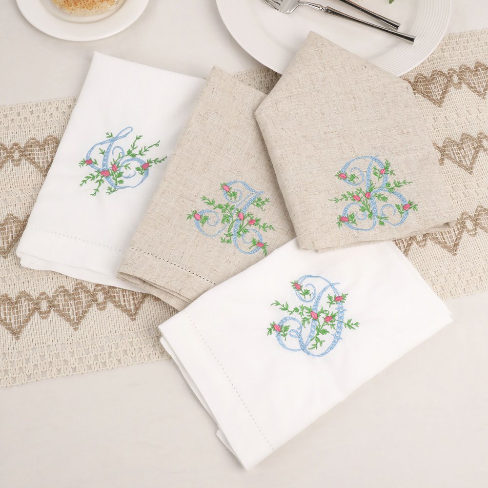 Featuring elegant Victorian-era monogram designs, this napkin creates a perfect blend of vintage charm and timeless sophistication. Delicate green leaves and vibrant pink floral buds add a touch of springtime warmth to your table setting. The embroidery design, with its meticulous stitching and rich color palette, not only enhances visual depth but also reflects your refined taste and style.