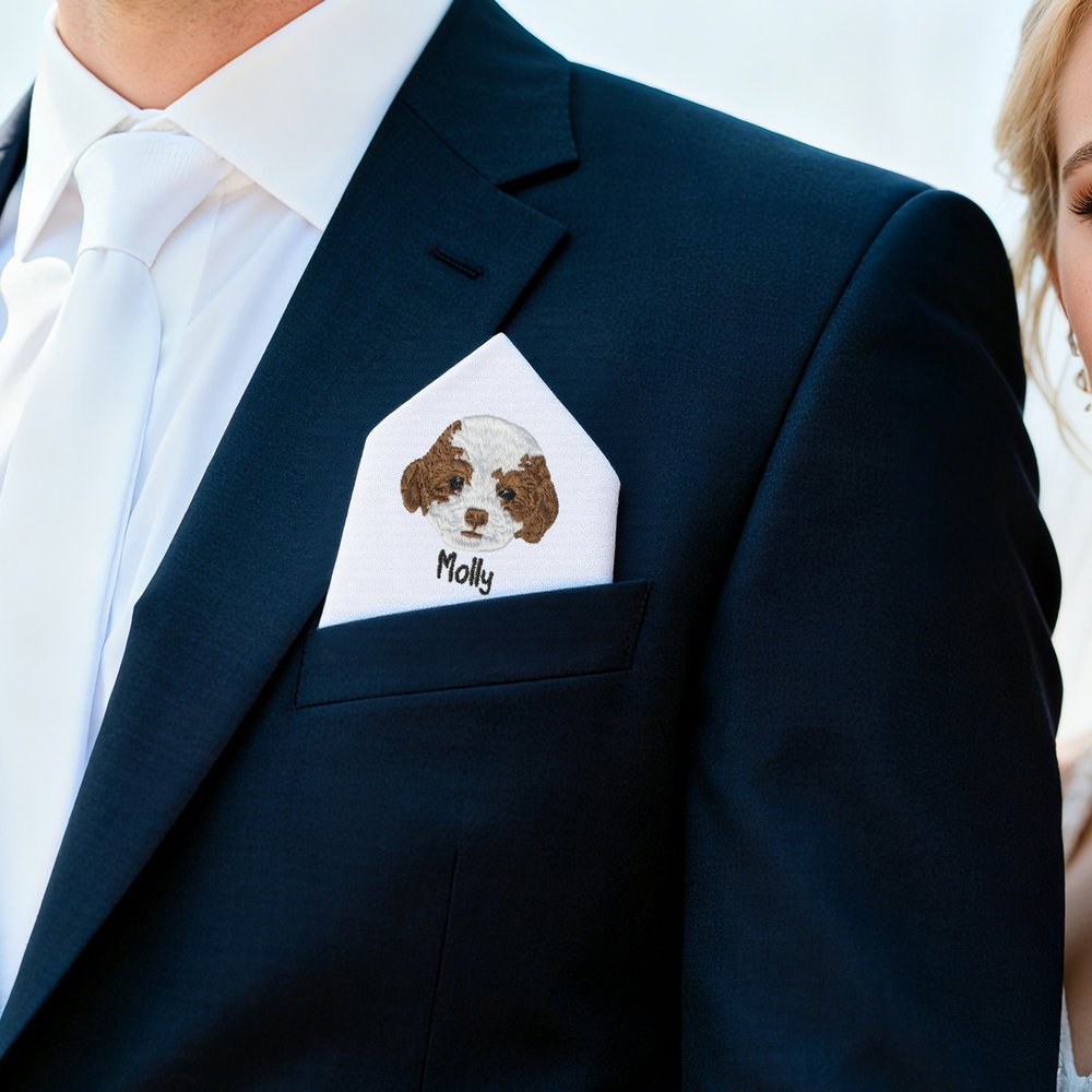 This embroidered craft handkerchief can be printed with 1-2 photos. You can upload a pet portrait according to your preferences and customize the pet's name. In a wedding, the dog is a symbol of companionship, representing the couple's love and commitment to their future life. Let this handkerchief become a precious souvenir.