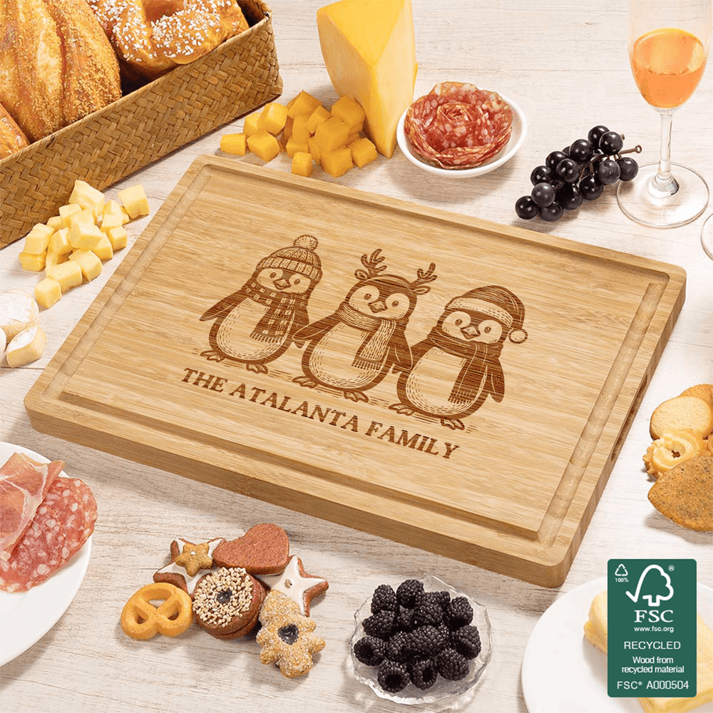 This personalized bamboo cutting board features custom engravings with Christmas-themed designs, including Santa Claus, Christmas Trees, Penguins, and Highland Cows. Perfect for adding a festive touch to your kitchen, it showcases your creativity and thoughtfulness, making it a unique and charming addition to your holiday decor.