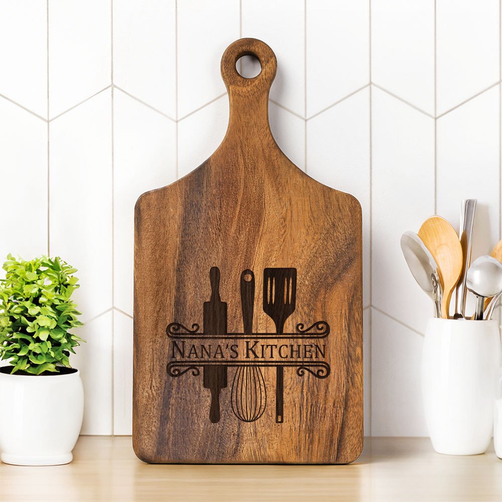 The board features an elegant engraving of kitchen cooking tools, including a spatula, a fork, and a whisk, all arranged in a visually appealing manner. The text is prominently displayed in the middle of these tools, making it a personalized and heartwarming touch.