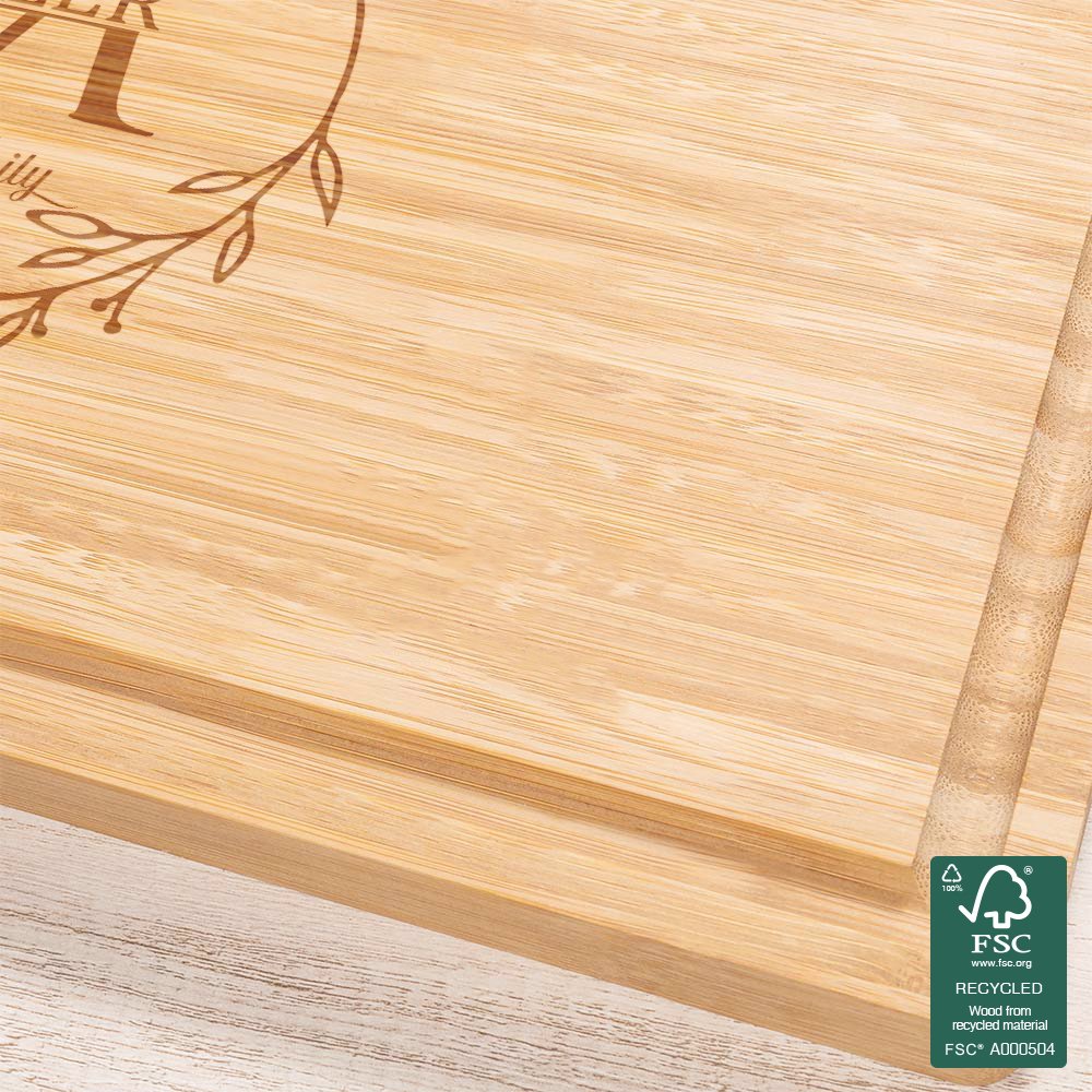Our personalized engraved family wreath bamboo cutting board is a thoughtful and unique gift. The elegantly designed leaf wreath surrounds personalized initials and names, adding a touch of sentiment to this cutting board. It is perfect for weddings, engagements, anniversaries, housewarmings, or as a special gift for friends and family.