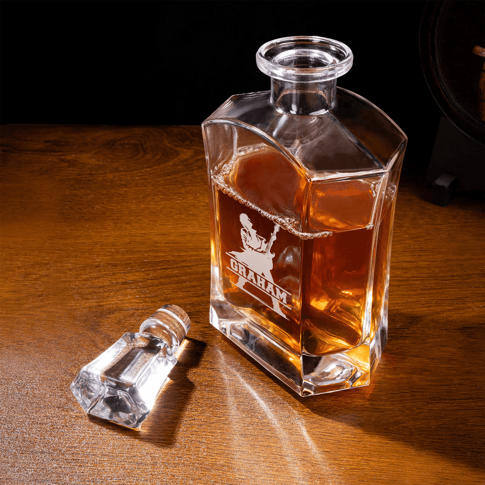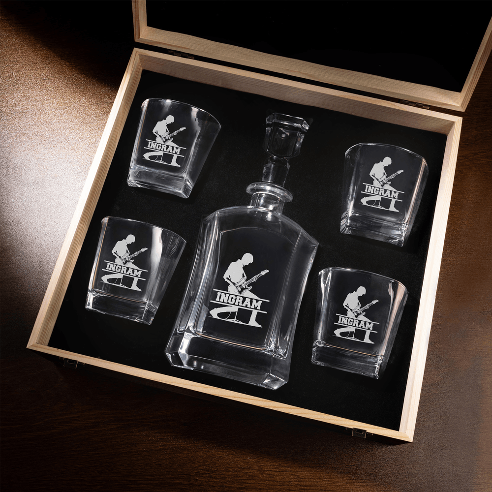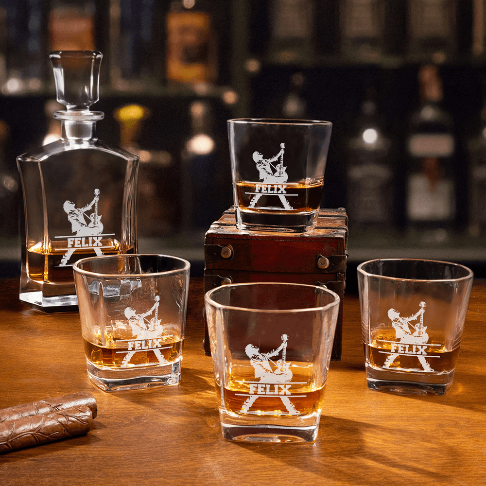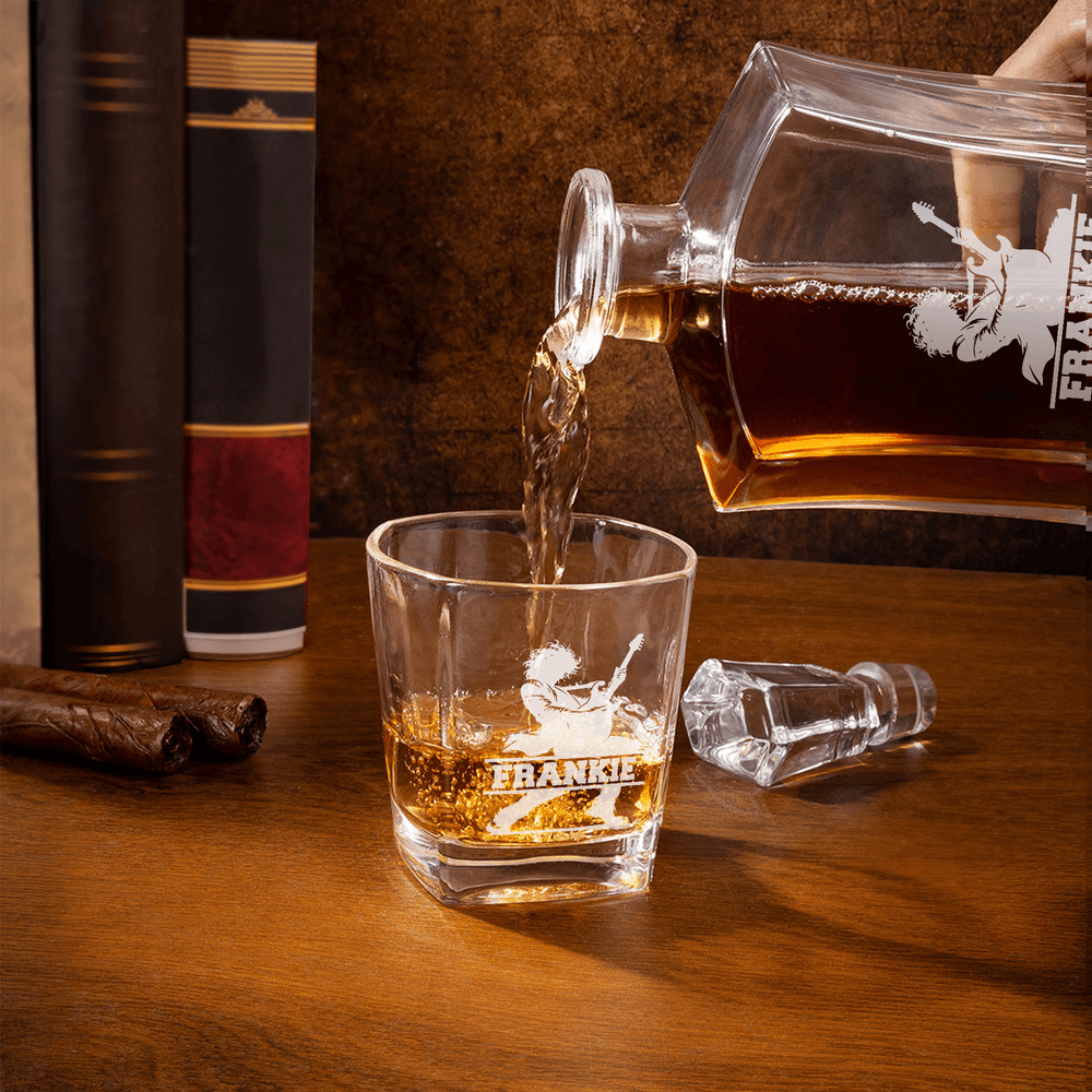 Each decanter is intricately engraved with the image of a guitarist, capturing the essence of music with a unique artistic style. This design adds personality and charm to the barware, beautifully showcasing a love for music. Coupled with personalized name customization, each piece not only serves a functional purpose but also carries a special commemorative touch, enriching its uniqueness and emotional depth.