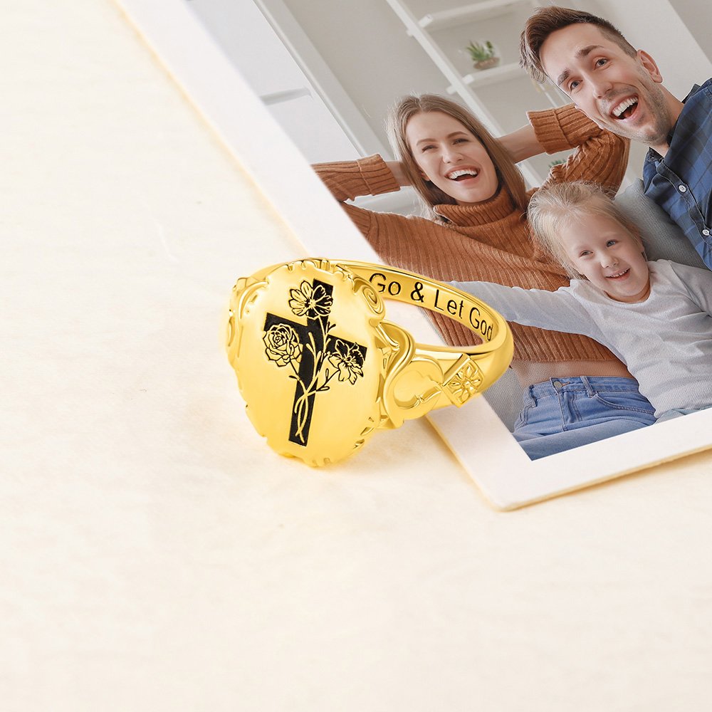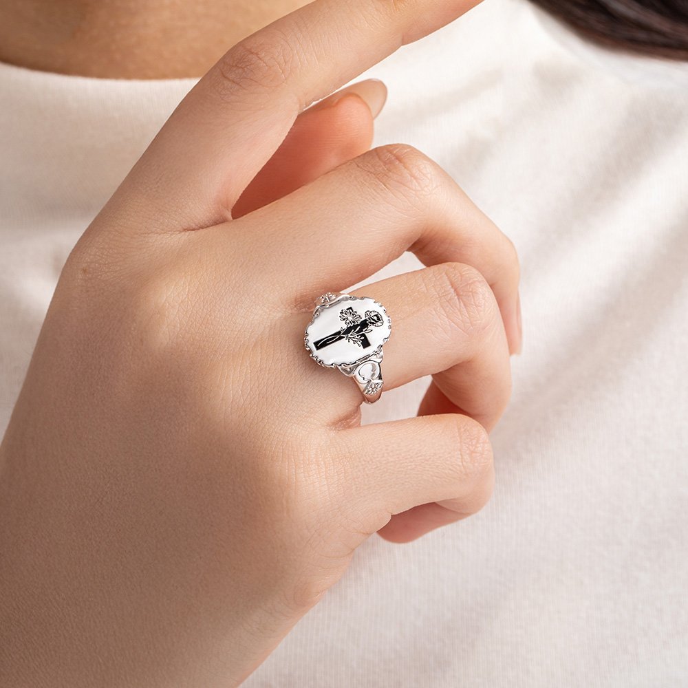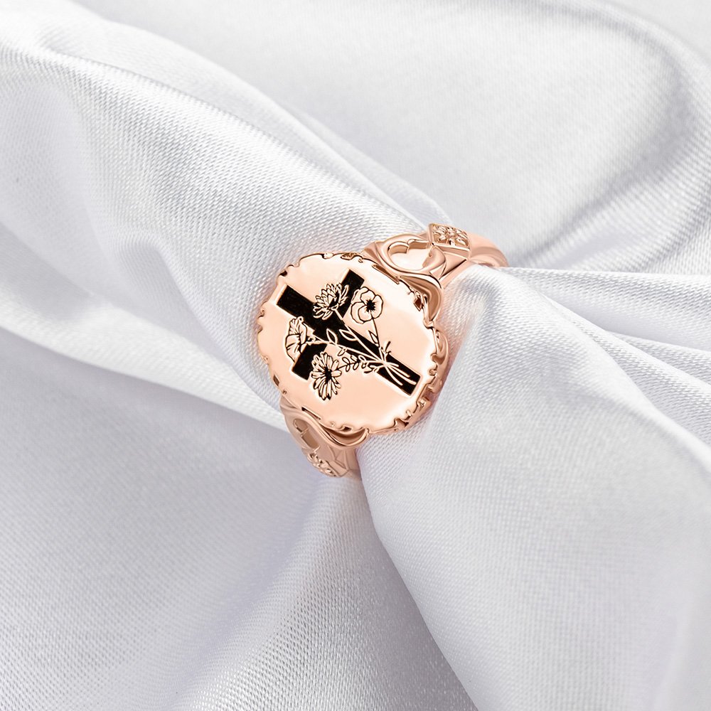 The design of this ring combines religious symbols and personalized elements, and the black cross pattern in the center not only adds a mysterious and solemn atmosphere but also symbolizes the firmness of faith and spirit. The family birthday bouquet around the ring can be customized according to the birth month of you and your family, each flower represents a different meaning and blessing, and the inner ring of the ring can also be customized text to make it even more special.