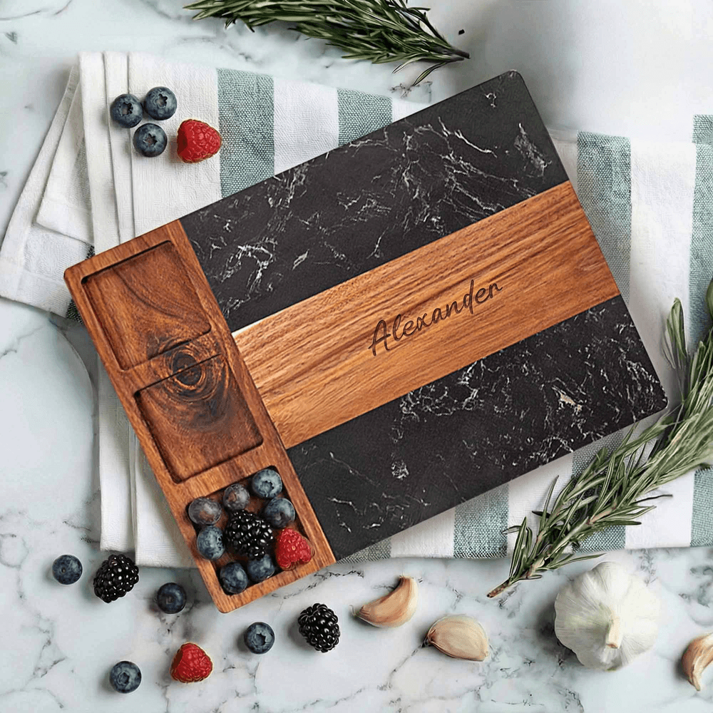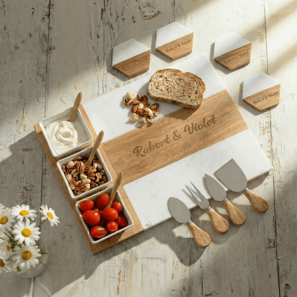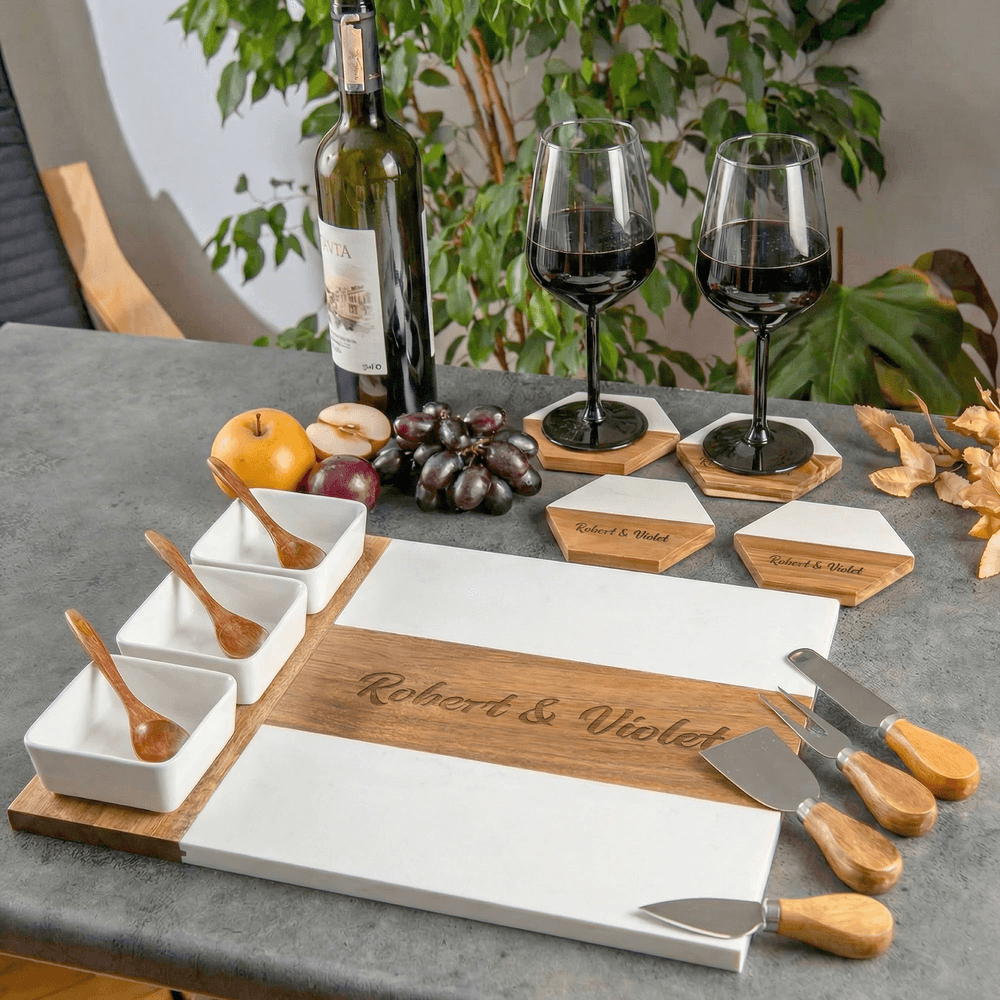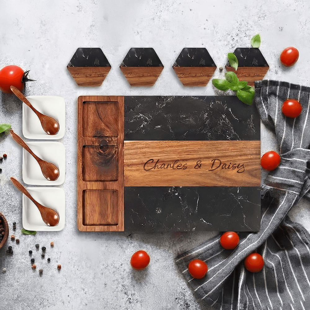 Personalized Engraved Name Marble 11 Pcs Cutting Board Coaster Set with Ceramic Bowl Birthday Anniversary Gift for Family Friend