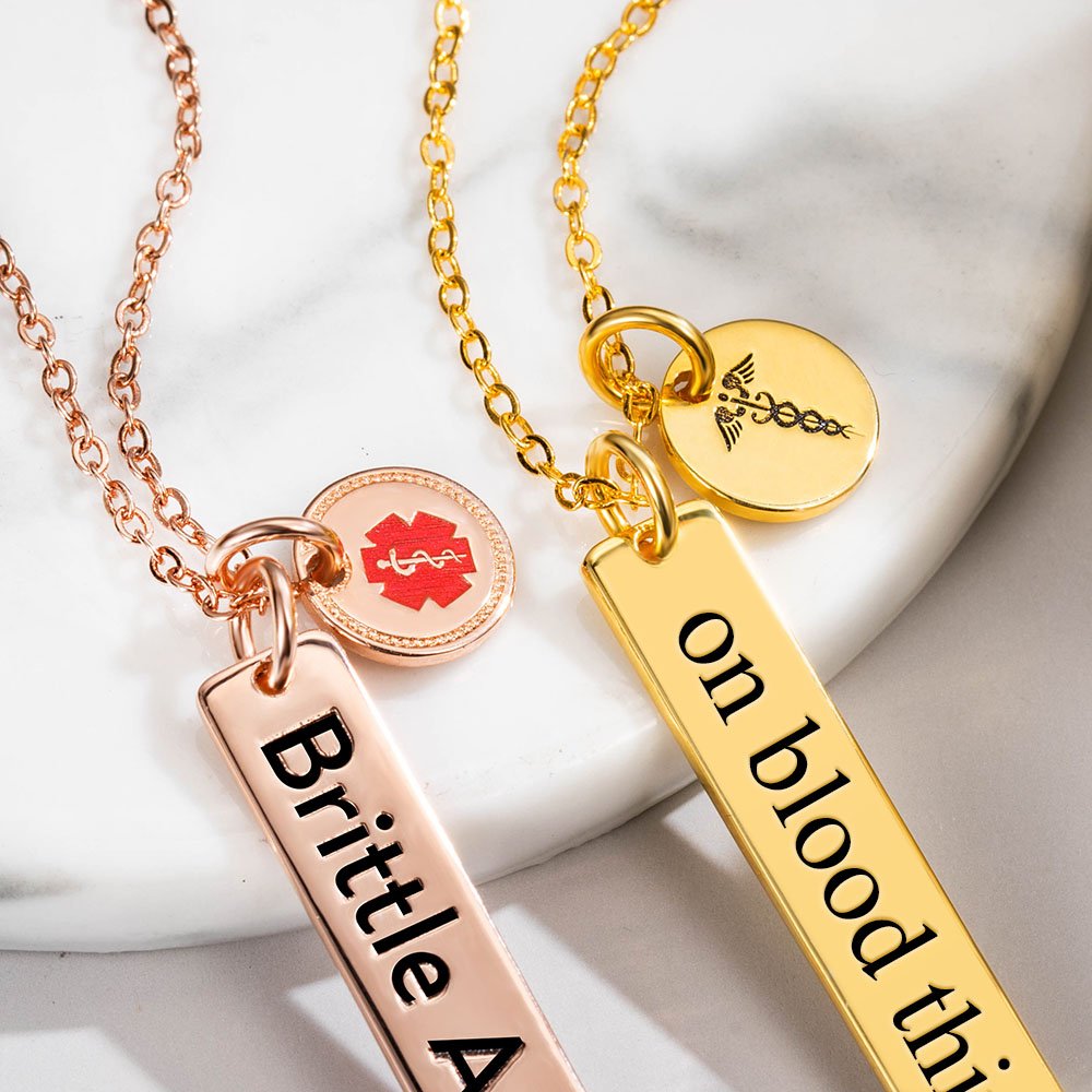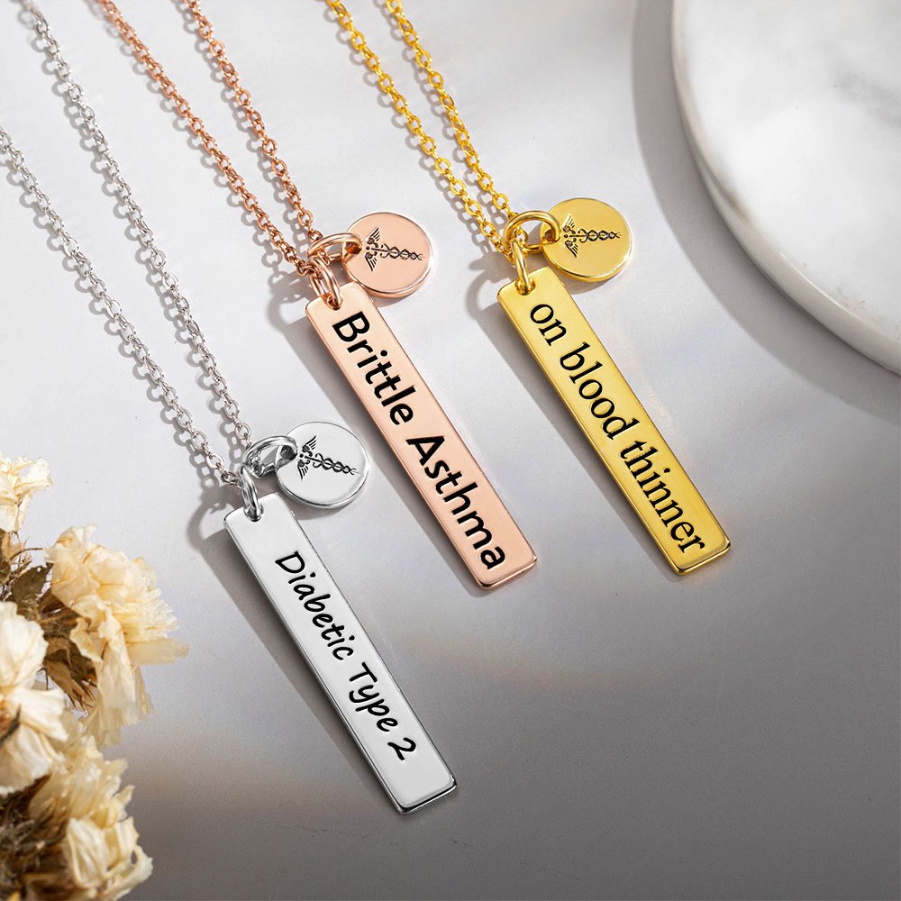 This dainty necklace can you peace of mind in case of an emergency. Customize it with a first and last name, allergy information, or even an emergency contact. Chain length can also be customized to fit different necklace sizes, making it the perfect medical alert necklace for children and adults alike! It features a bar front and back availability that contains your information and a small coin with the medical symbol.